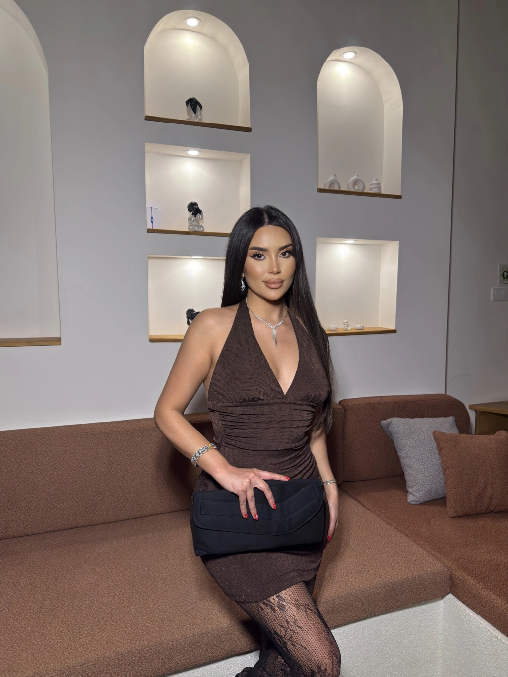 Kahverengi Simli Boyundan Bağlamalı Mini Elbise