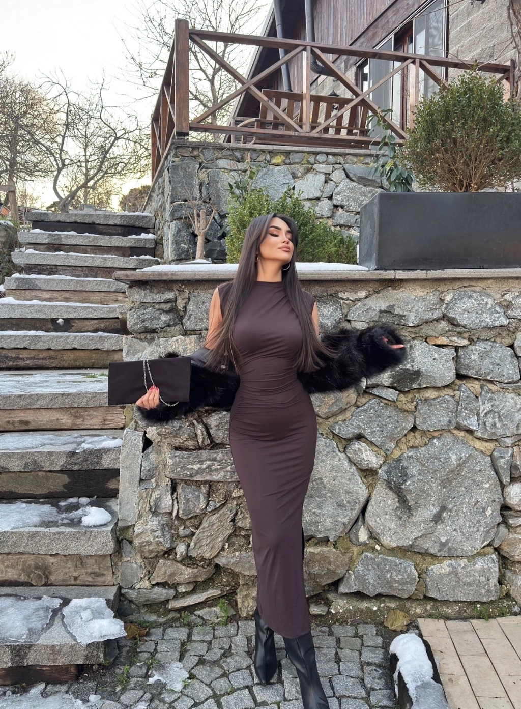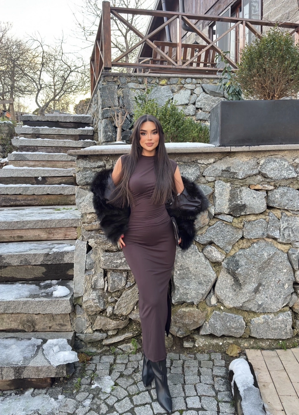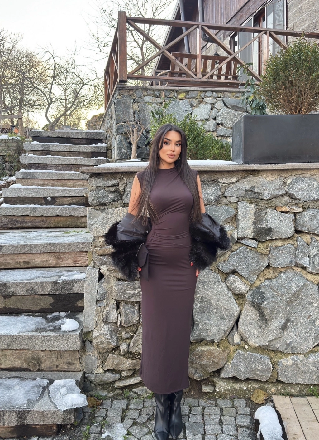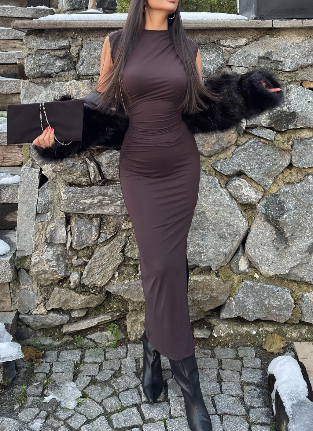 Kahverengi Kolsuz Yırtmaç Detay Uzun Elbise