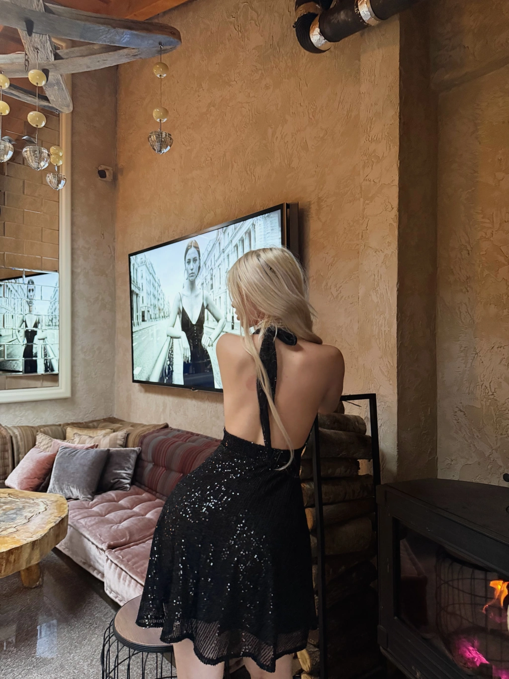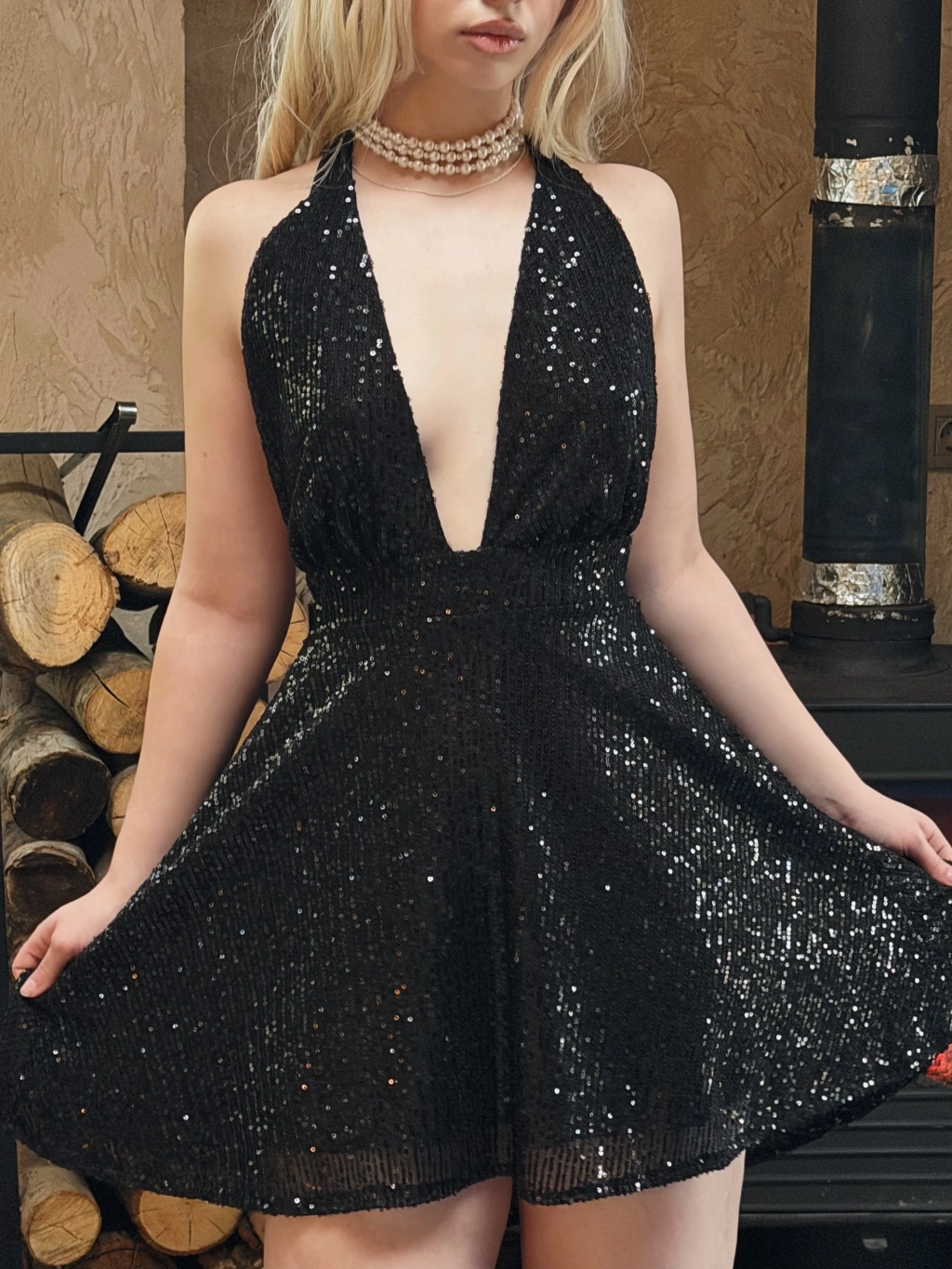 Siyah Boyundan Bağlamalı Payetli Elbise