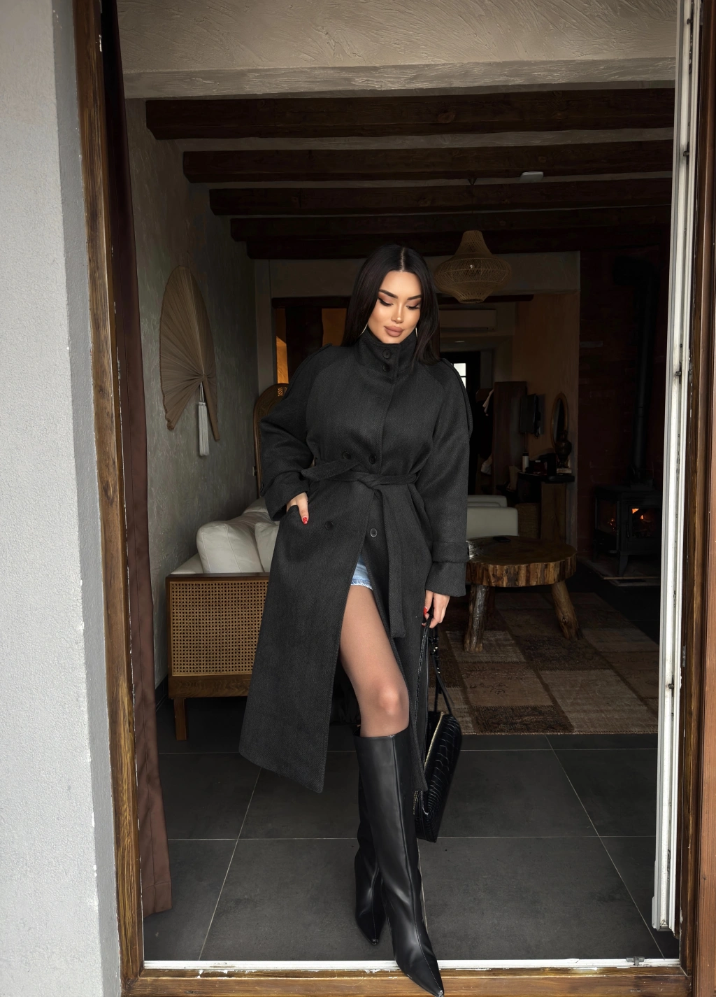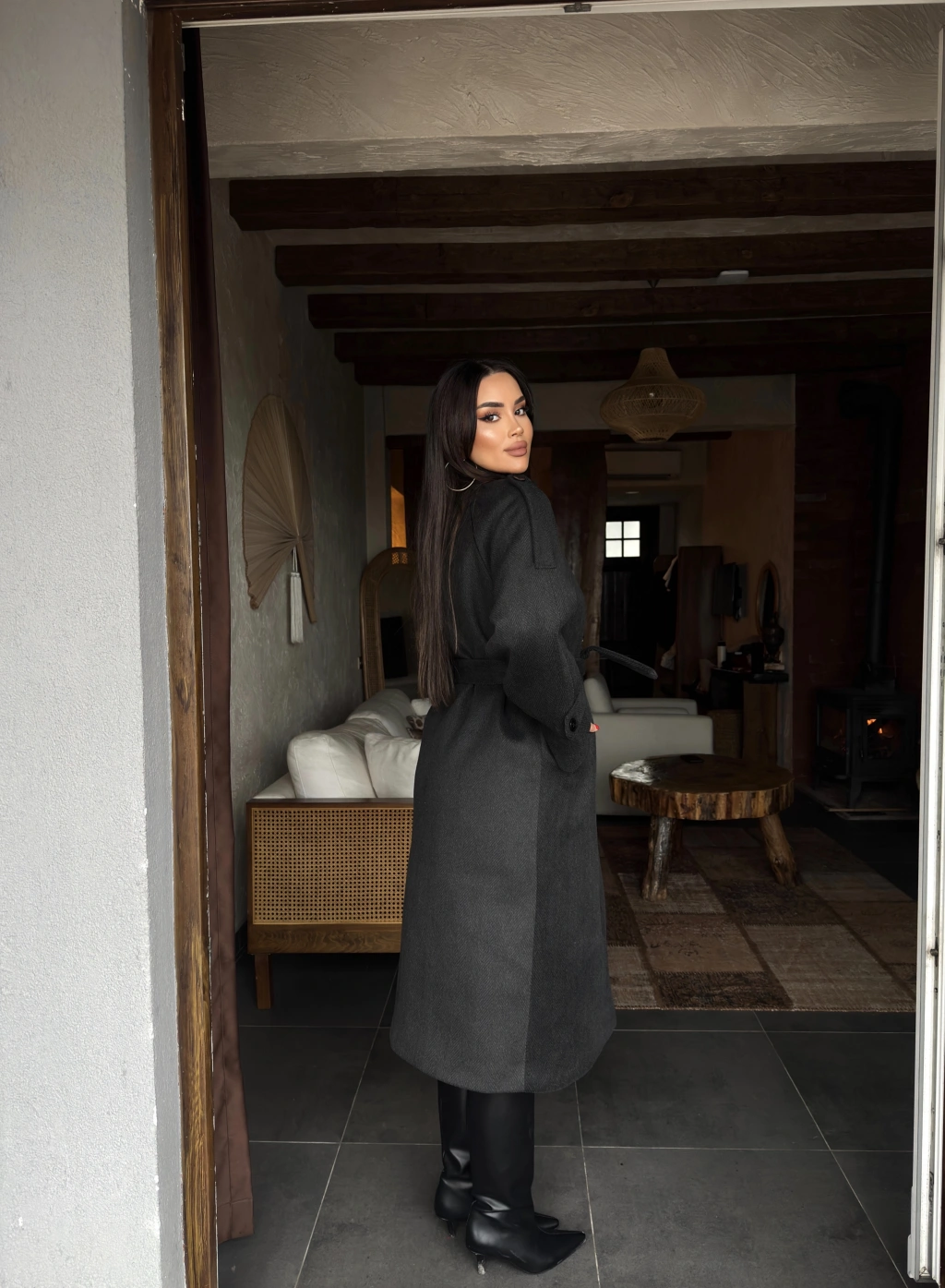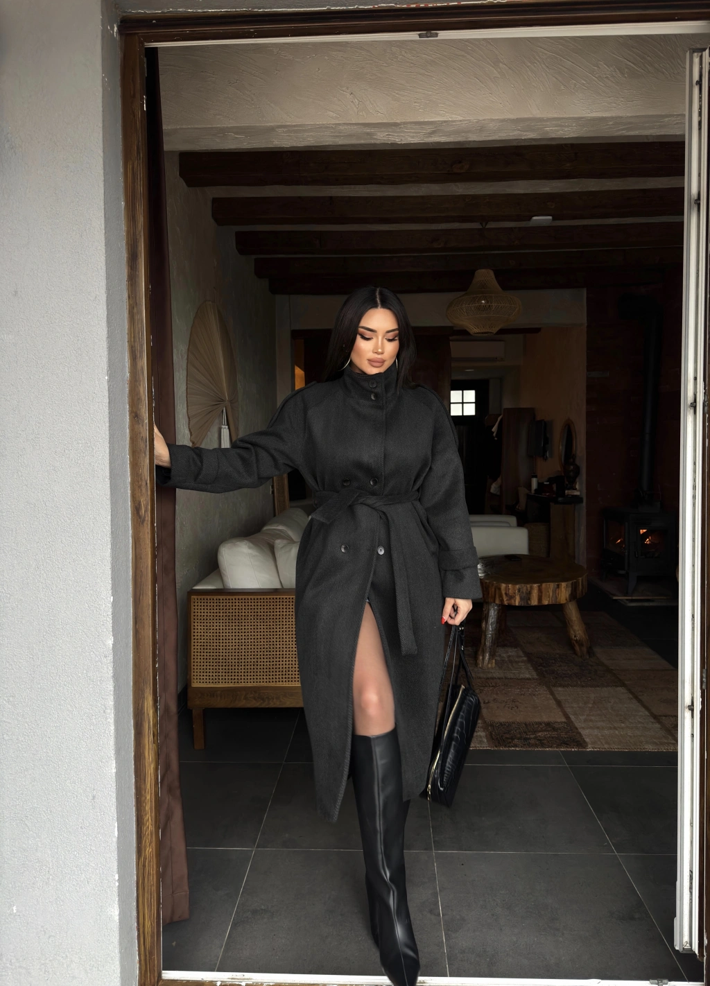 Antrasit Dik Yaka Uzun Kaşe Kaban