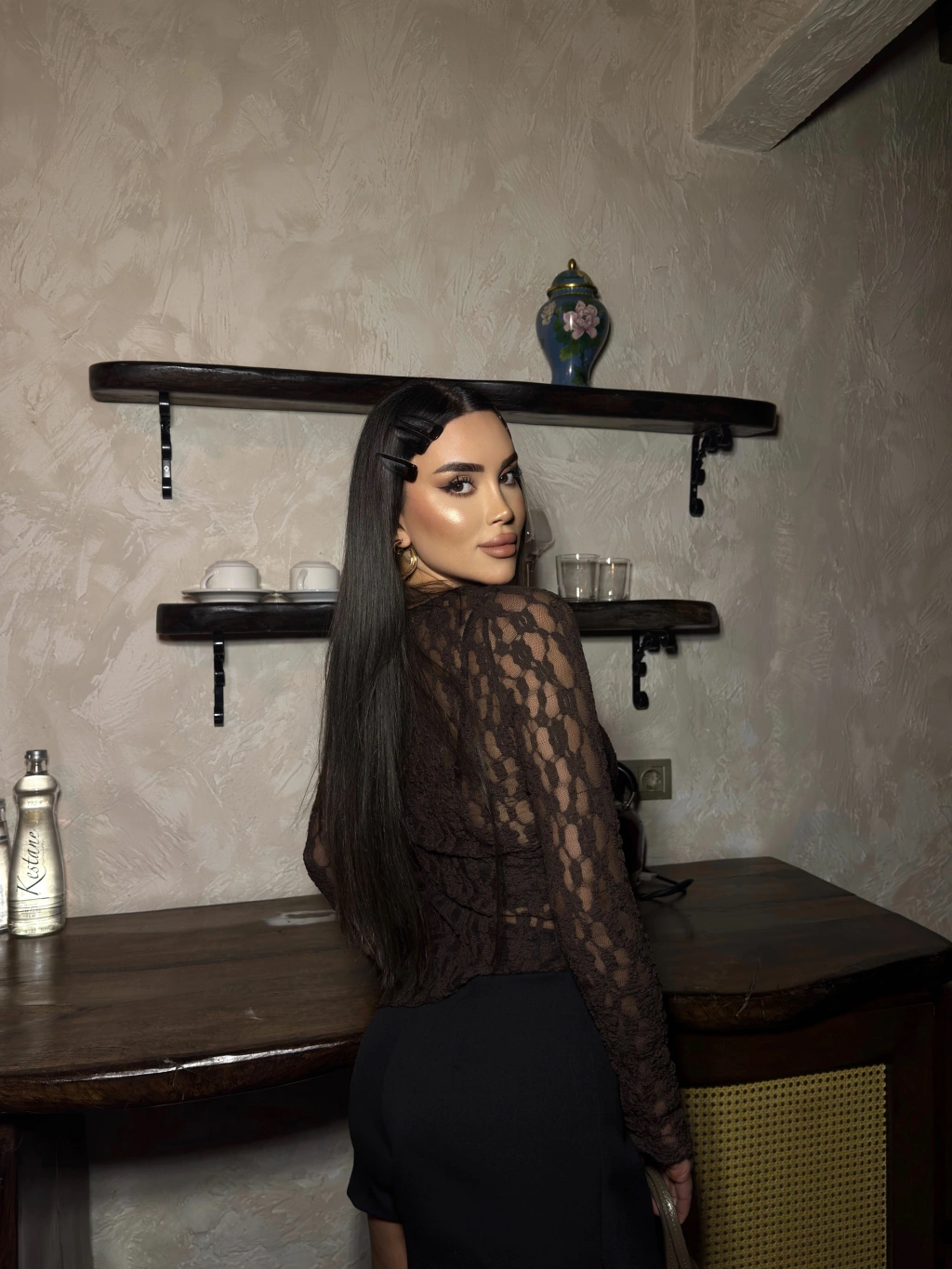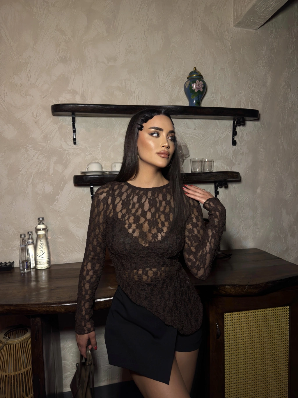 Kahverengi Asimetrik Dantel Bluz