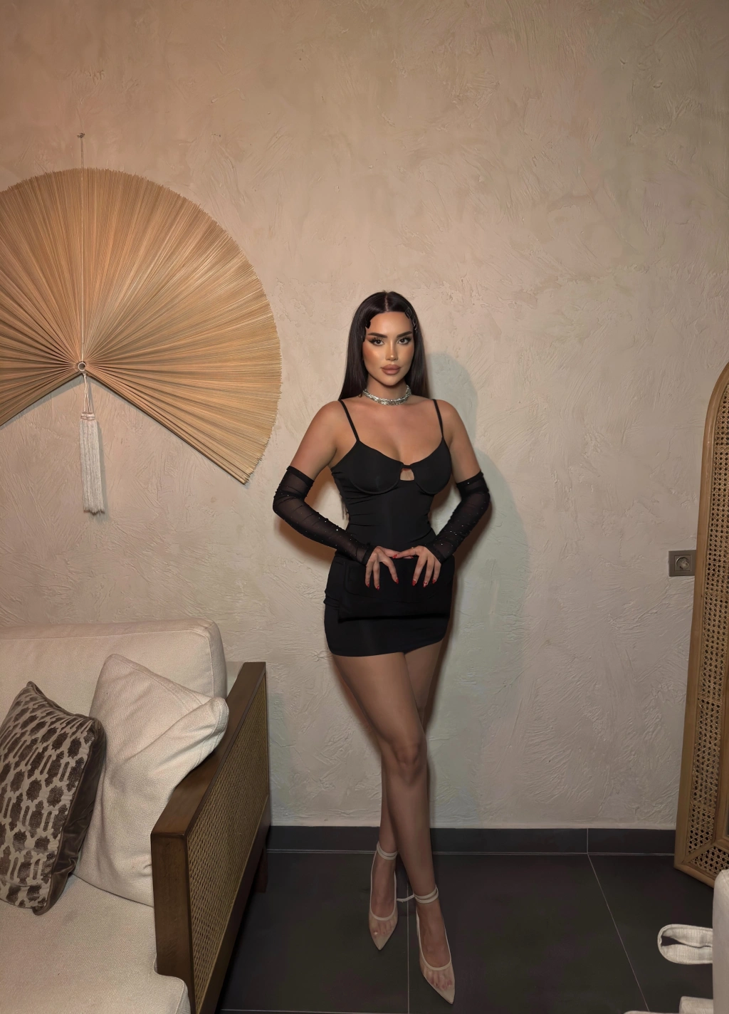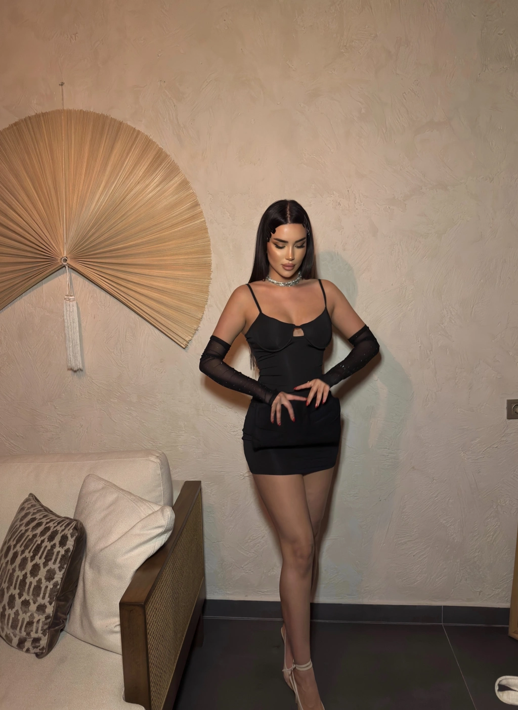 Siyah Kolları Tül Gloplu Elbise