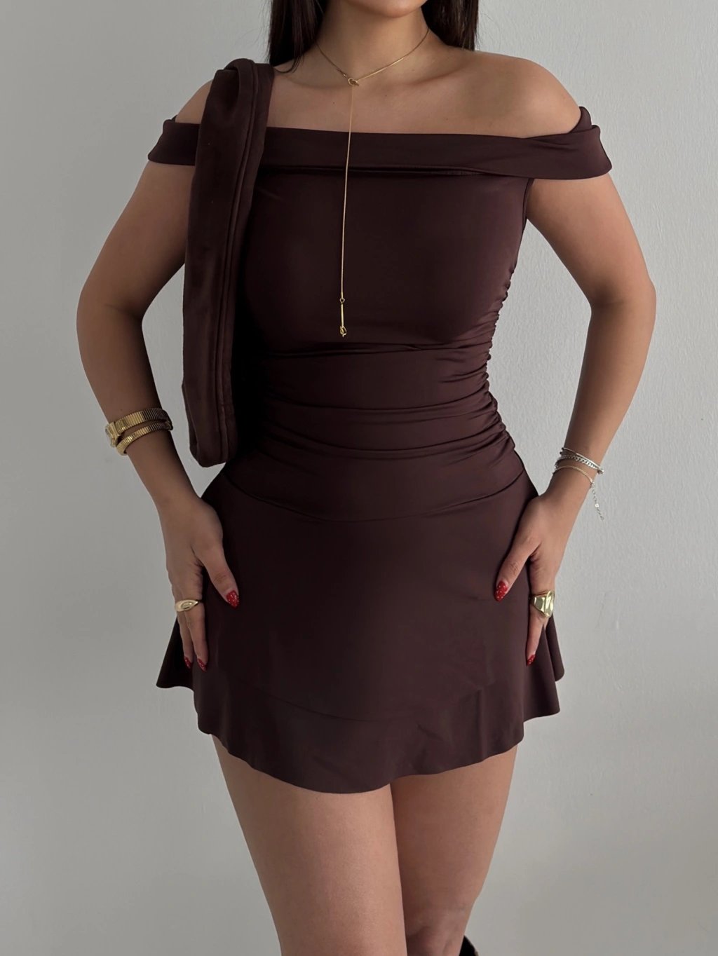 Kahverengi Madonna Yaka Drapeli Kısa Elbise