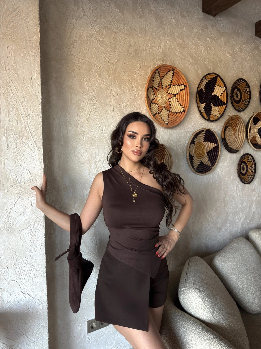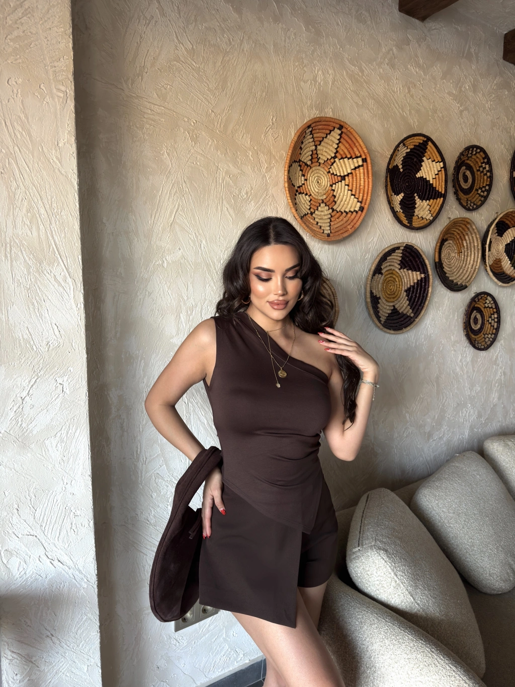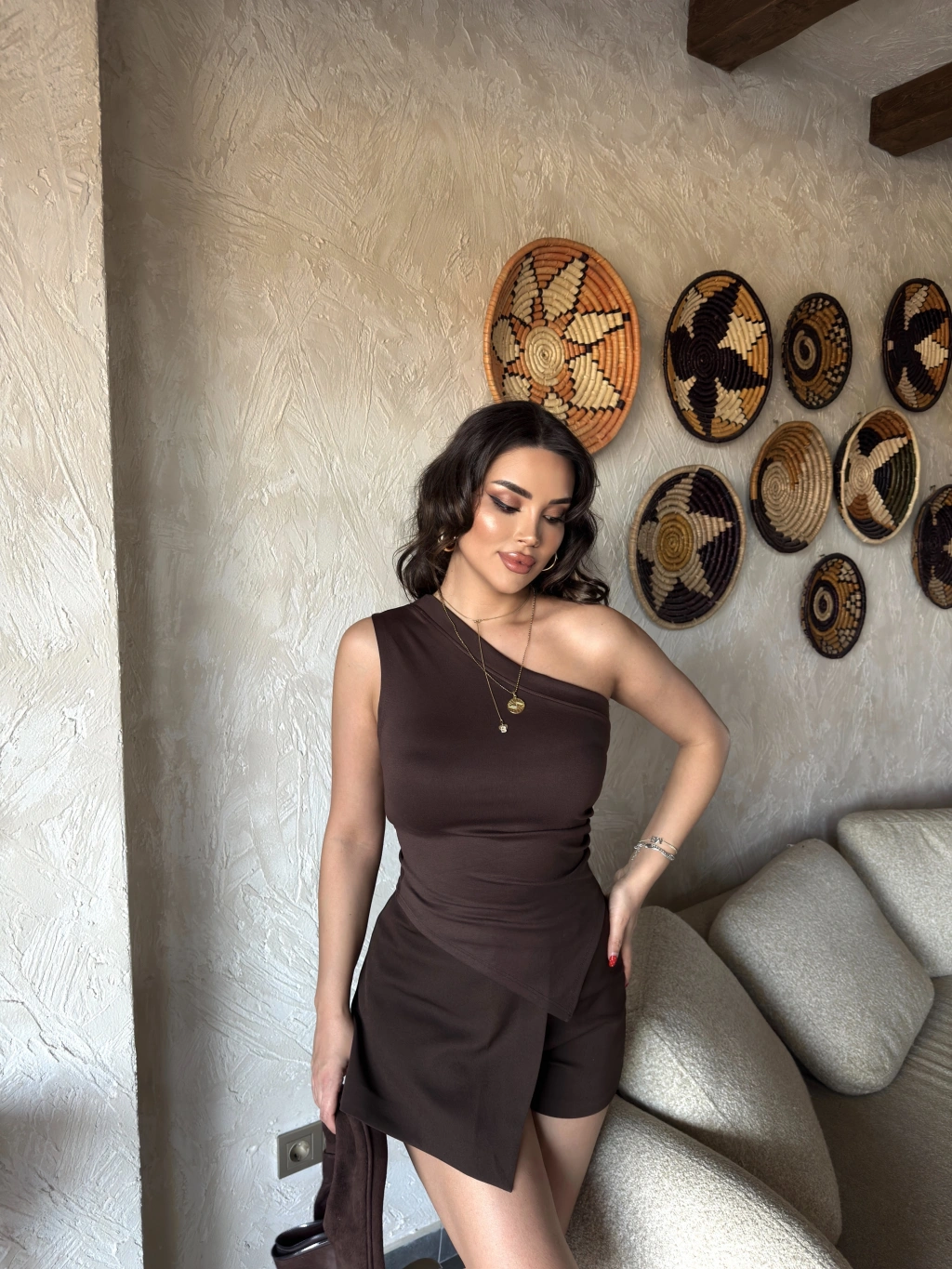 Kahverengi Asimetrik Tek Omuz Crop