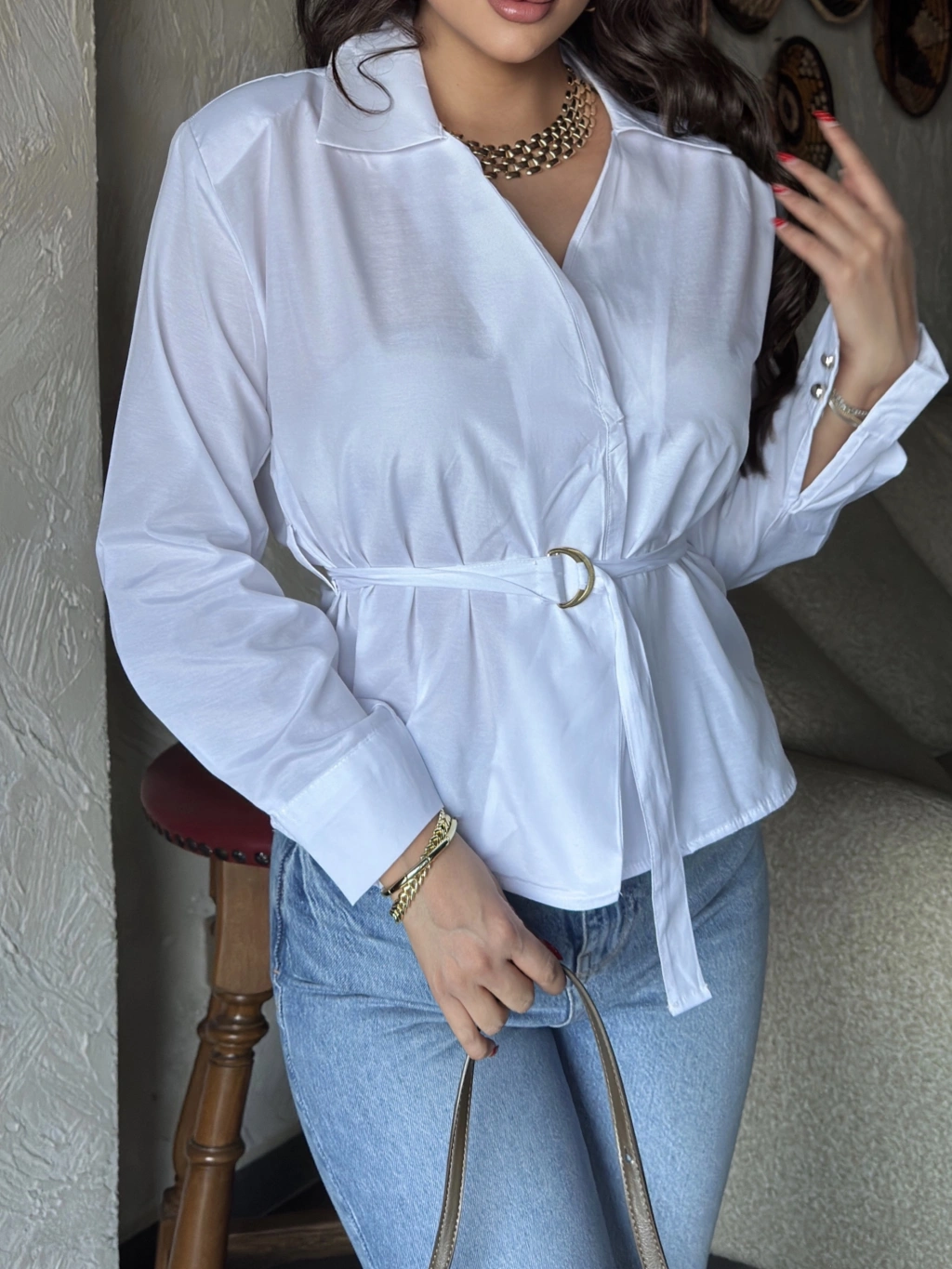 Beyaz Gold Kemerli Gömlek