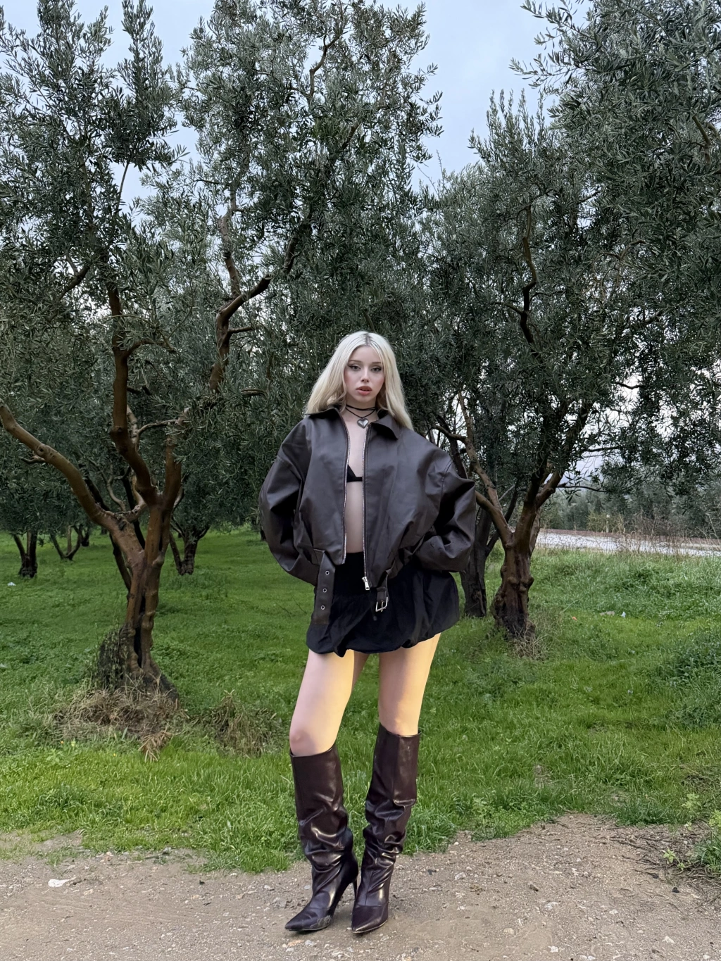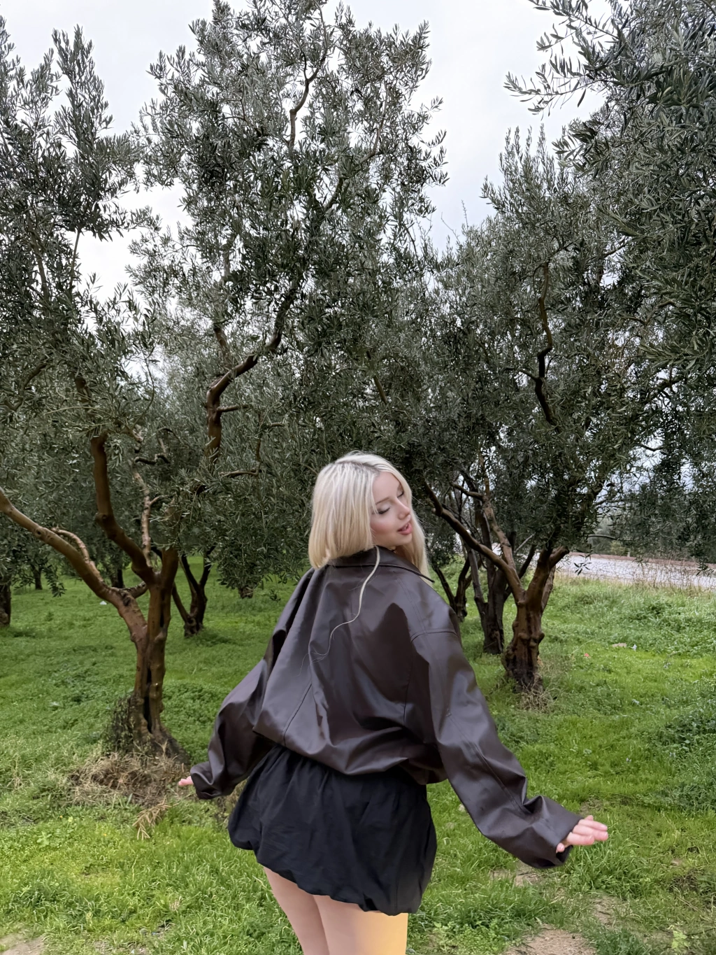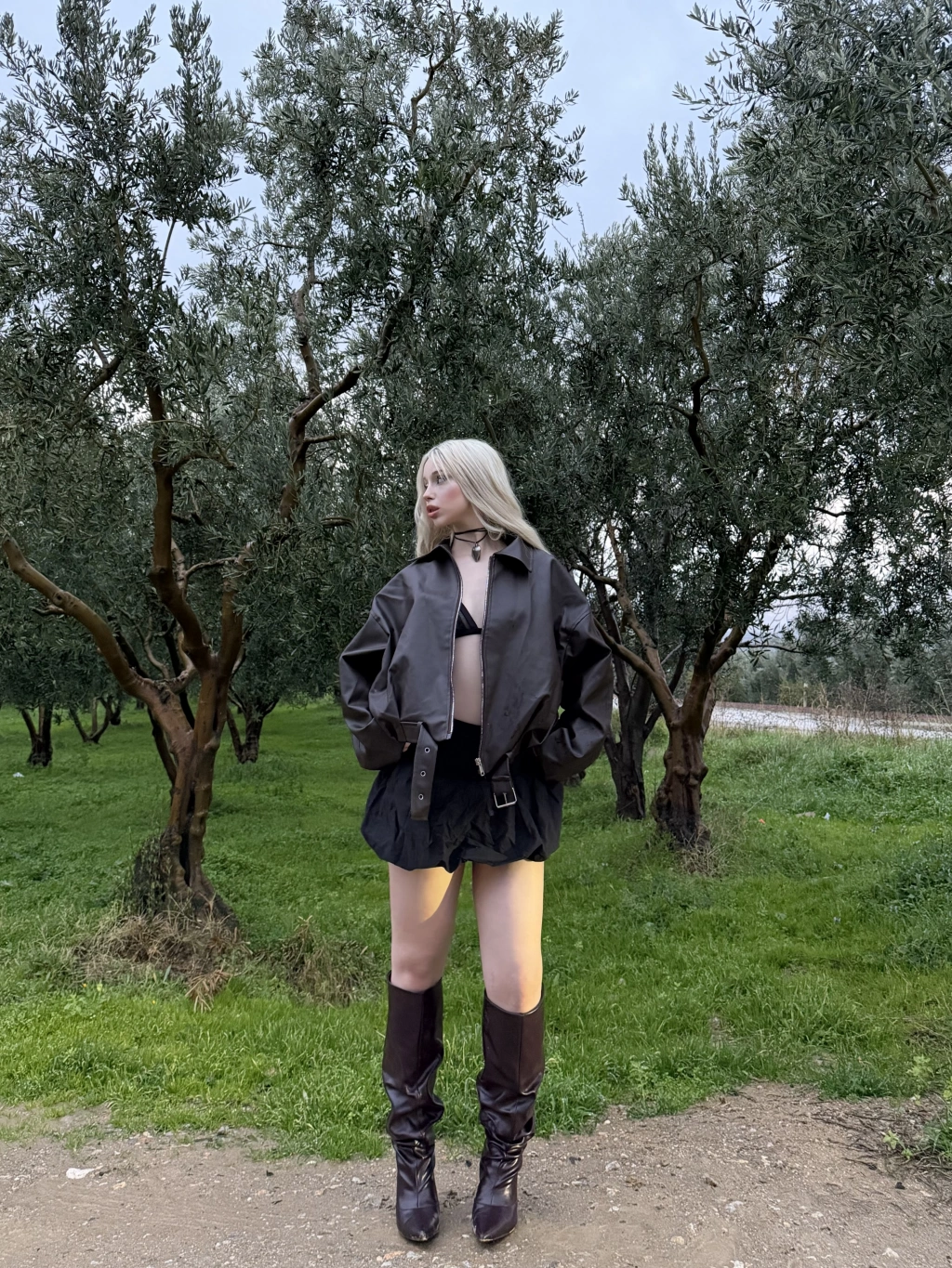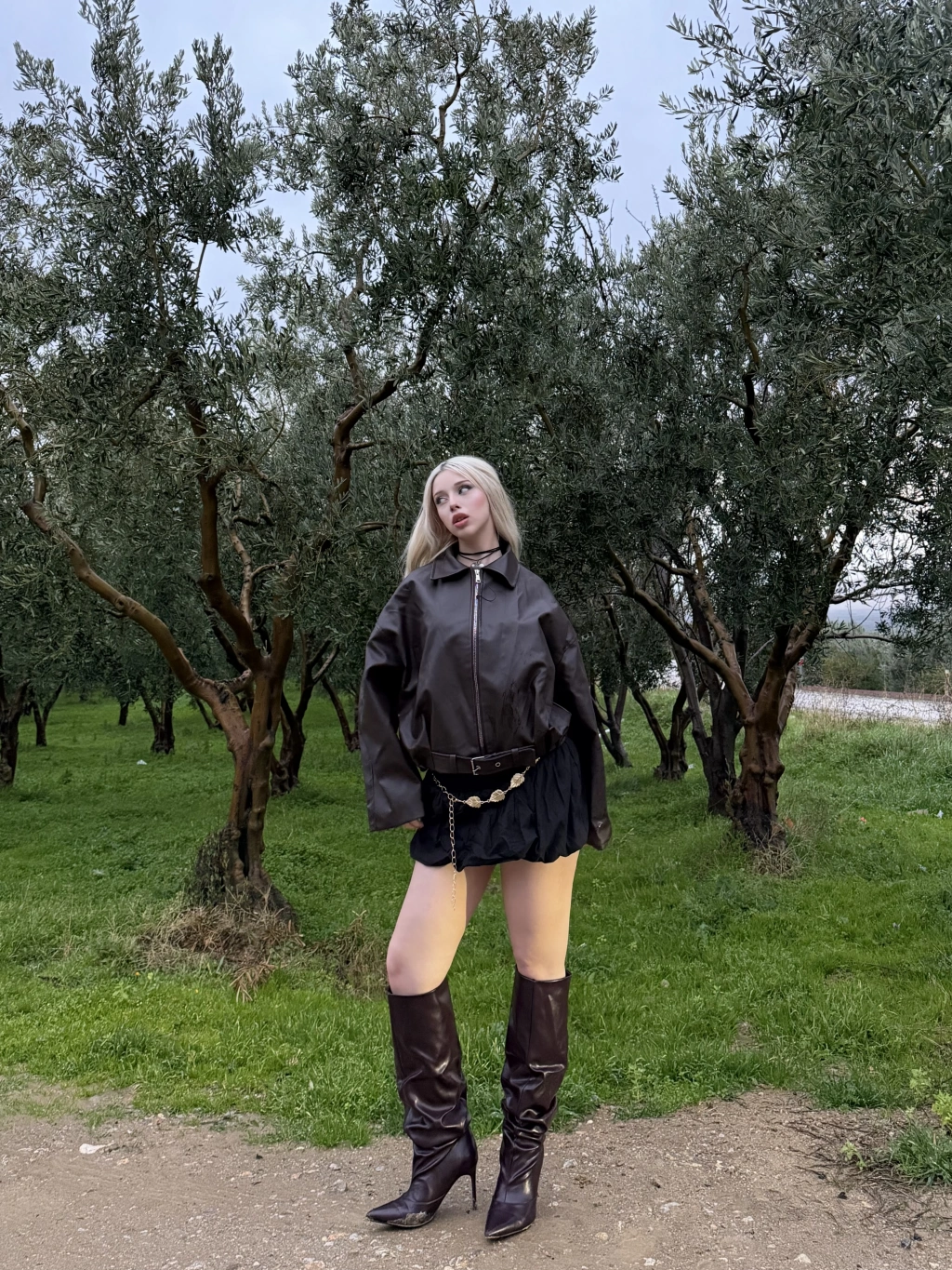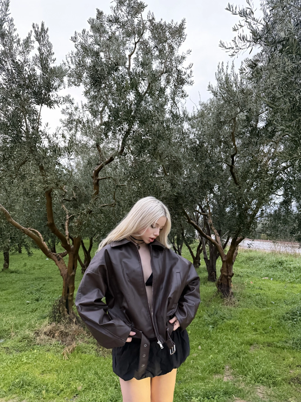 Kahverengi Kemer Detay Oversize Deri Ceket