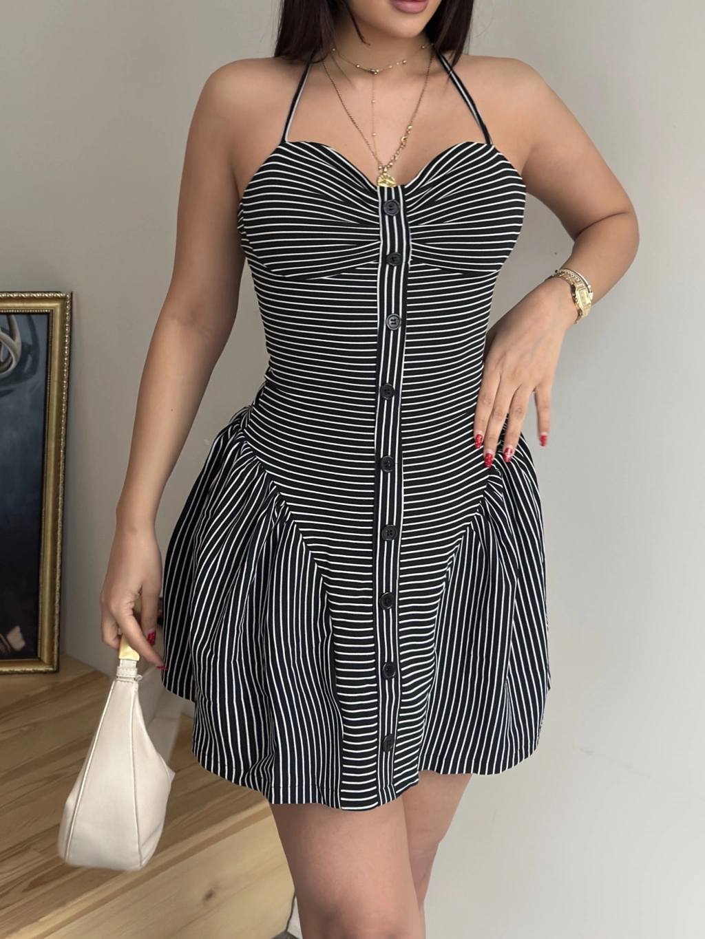 Siyah Çizgili Düğme Detay Elbise