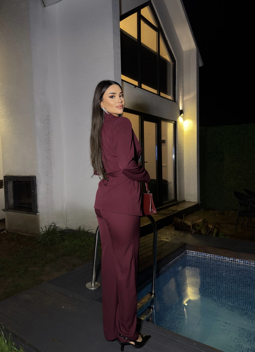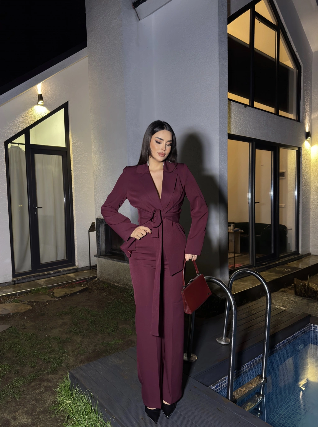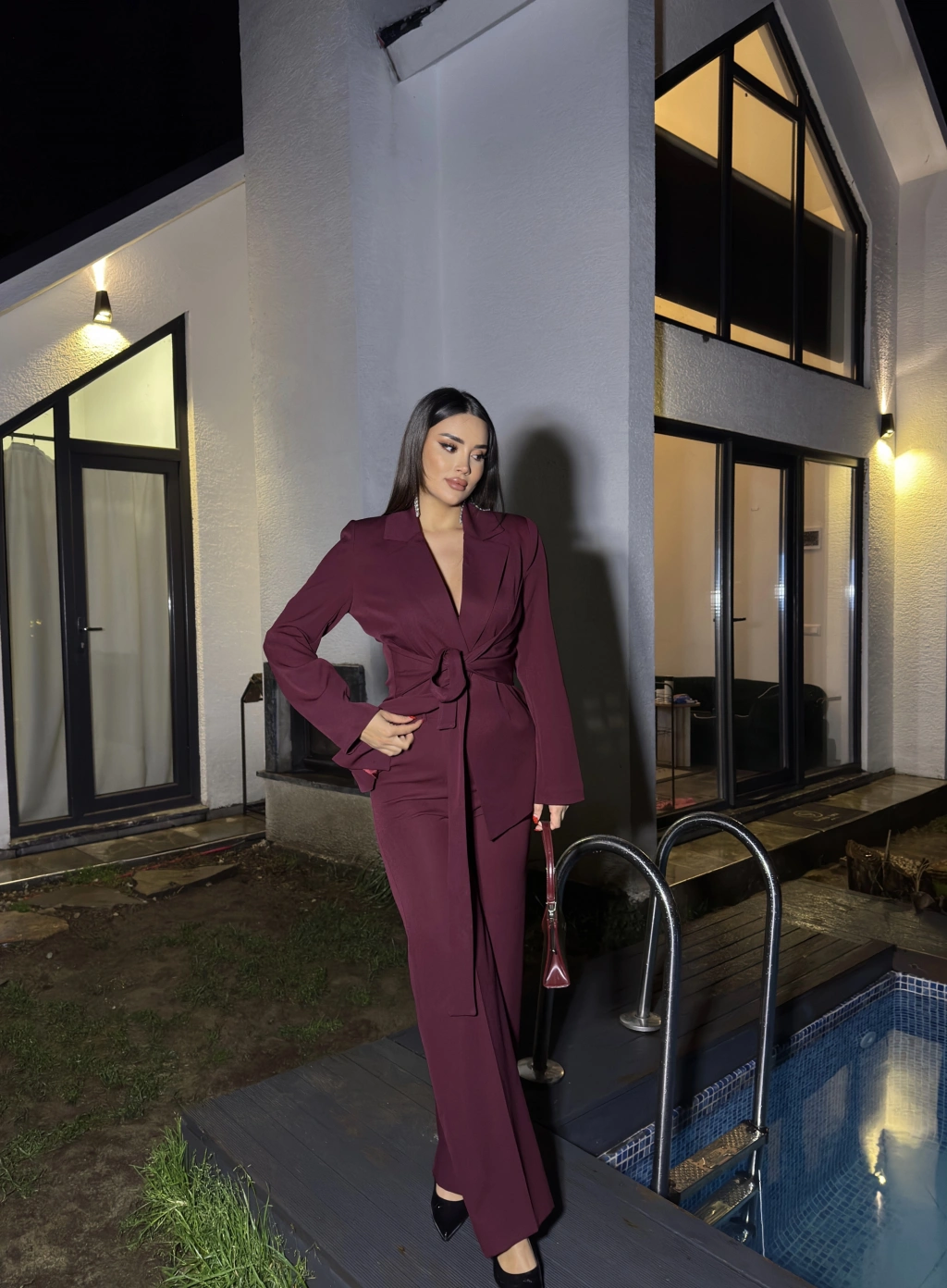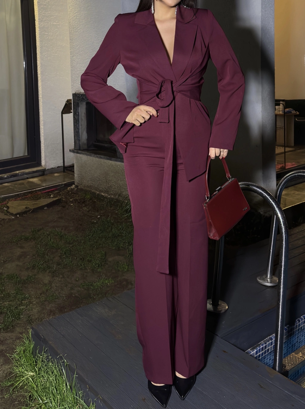 Bordo Bağlamalı Blazer Takım
