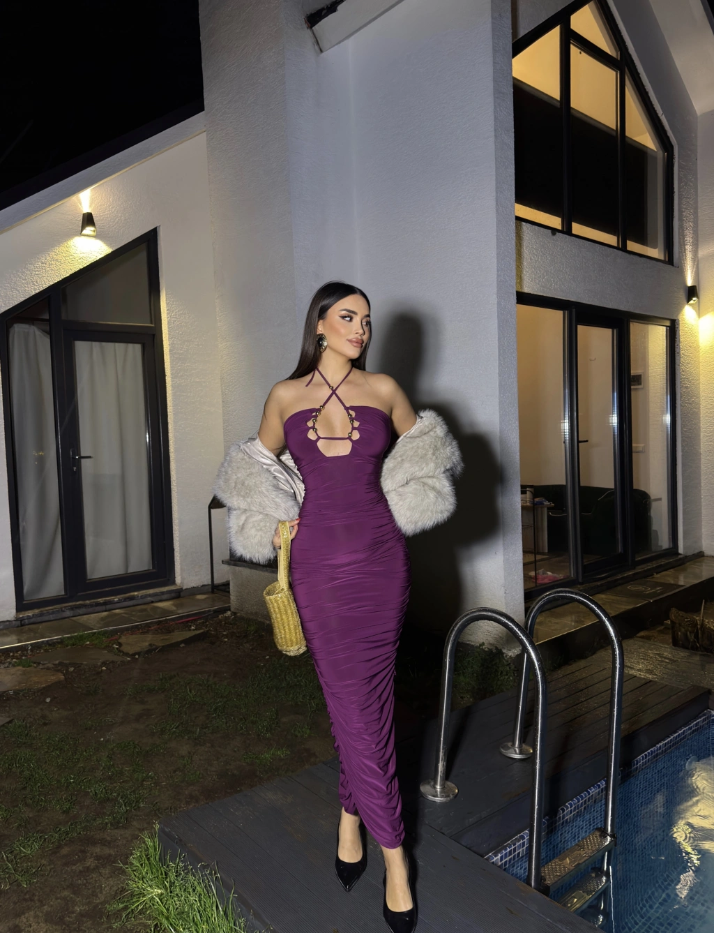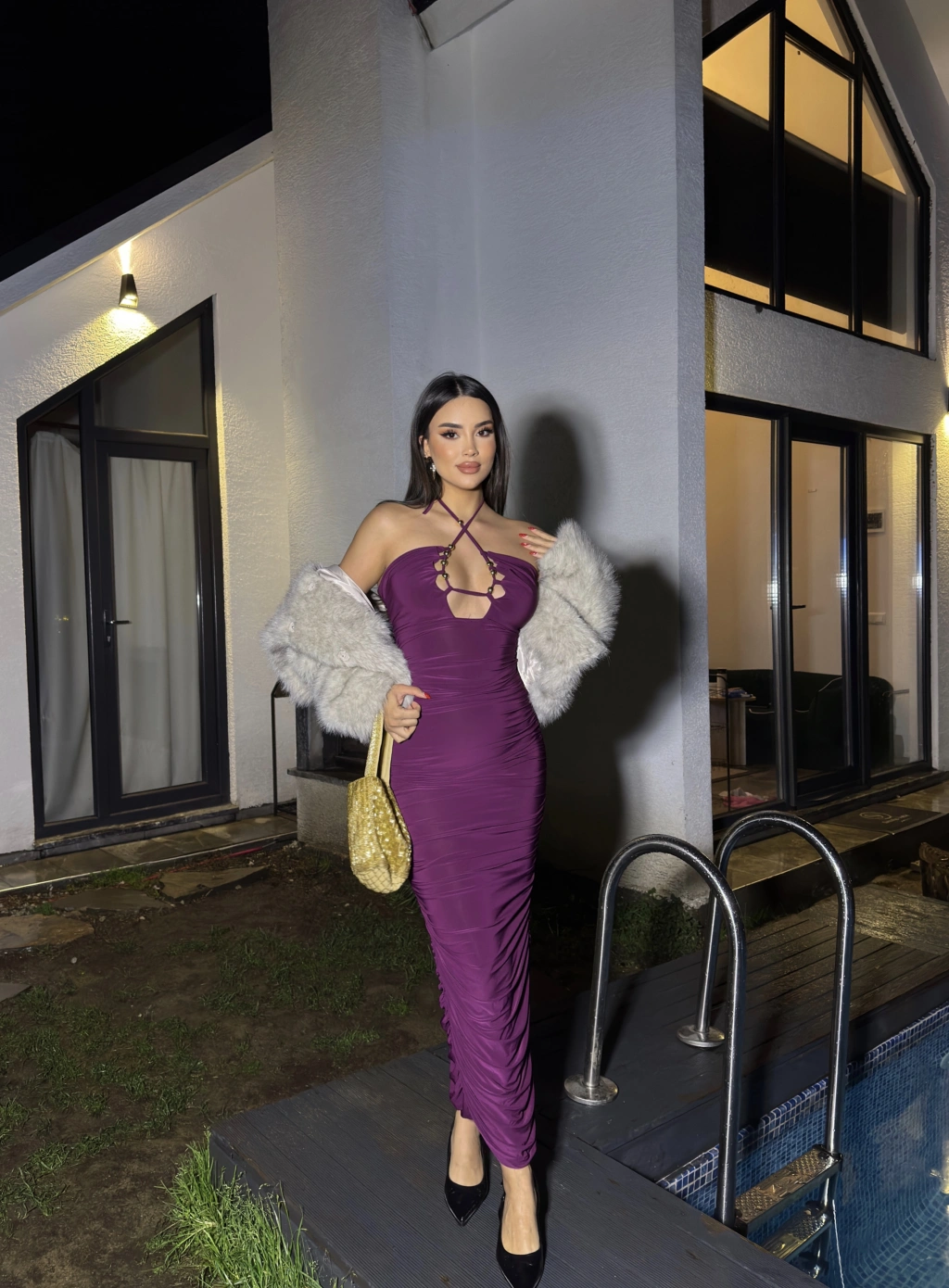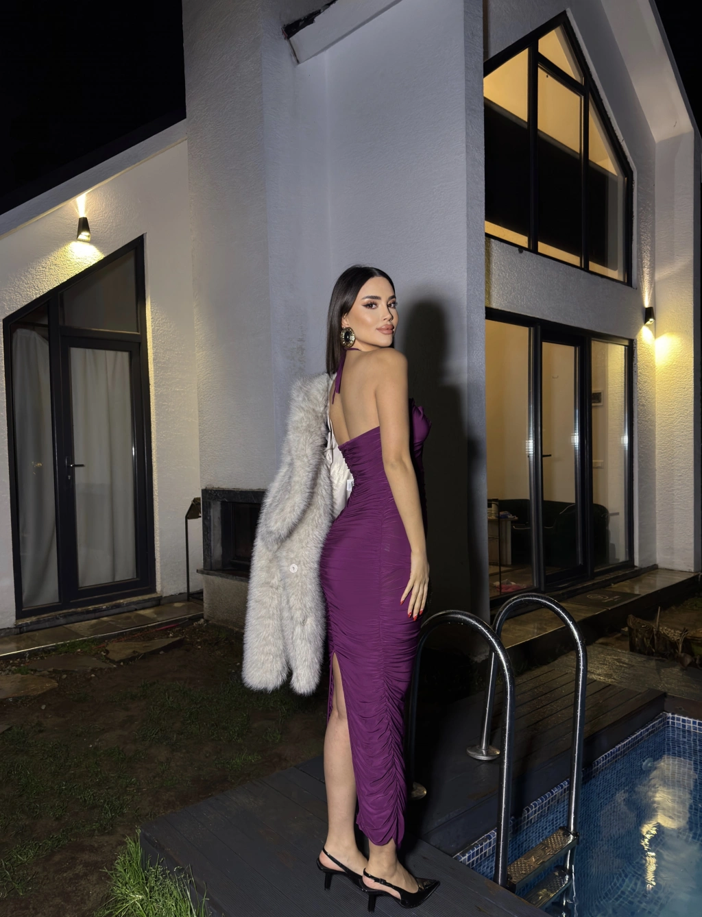 Mürdüm Boyundan Bağlamalı Drapeli Tasarım Elbise