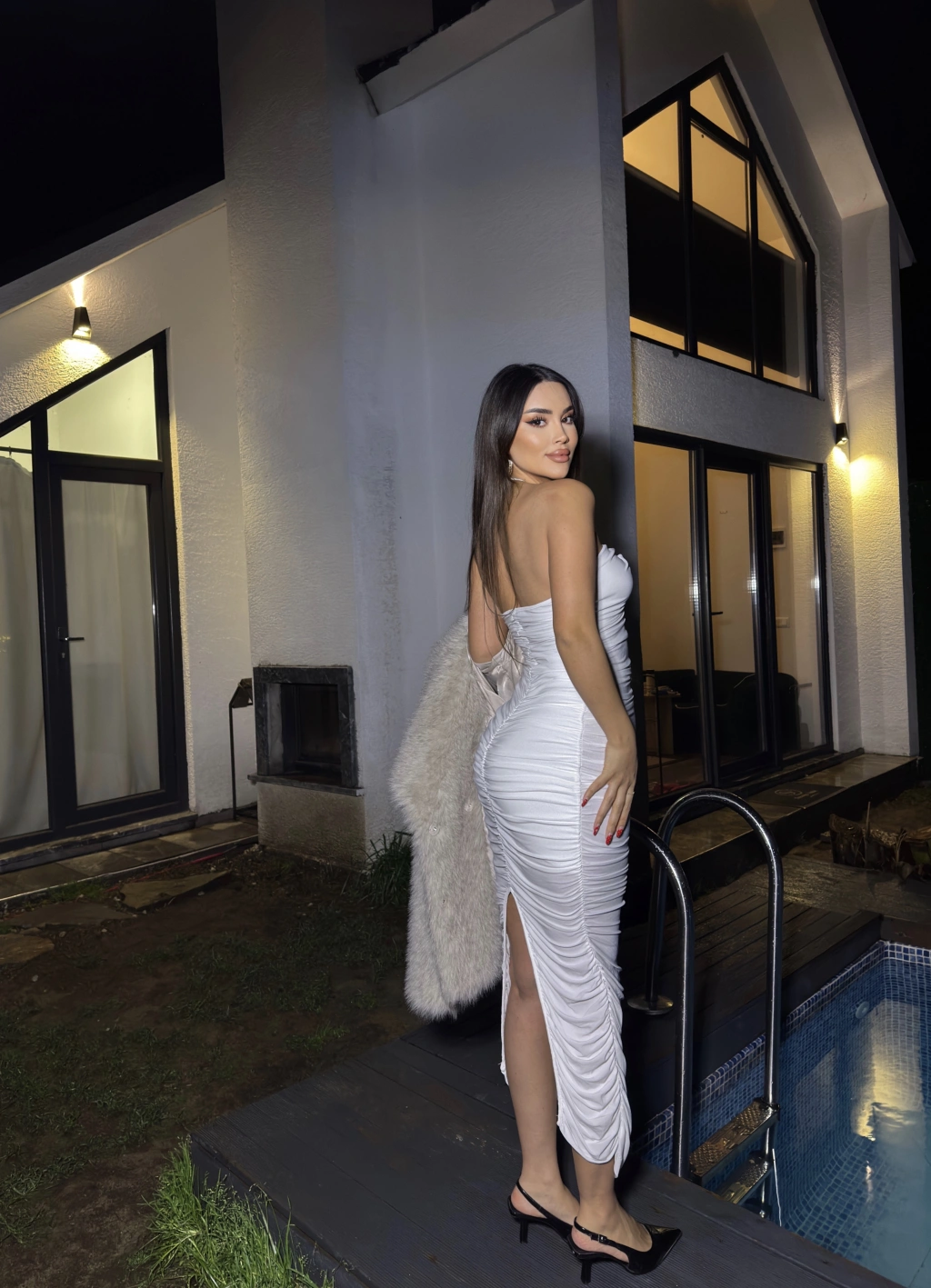 Beyaz Boyundan Bağlamalı Drapeli Tasarım Elbise