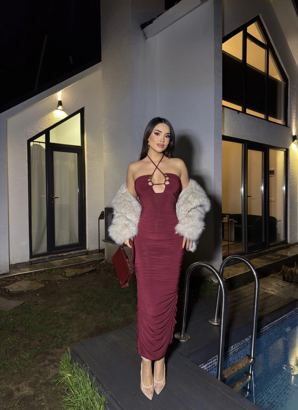 Bordo Boyundan Bağlamalı Drapeli Tasarım Elbise