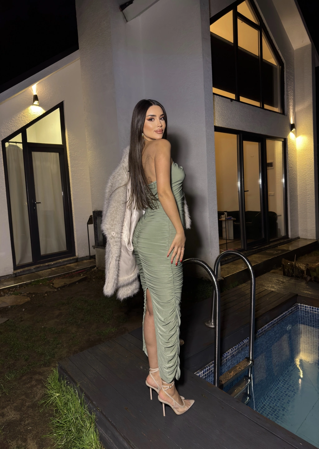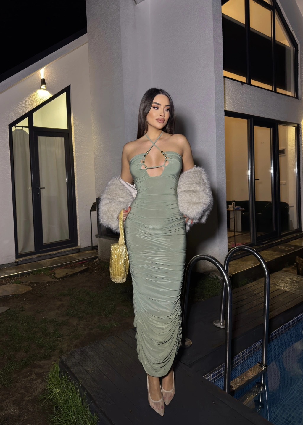 Mint Yeşil Boyundan Bağlamalı Drapeli Tasarım Elbise