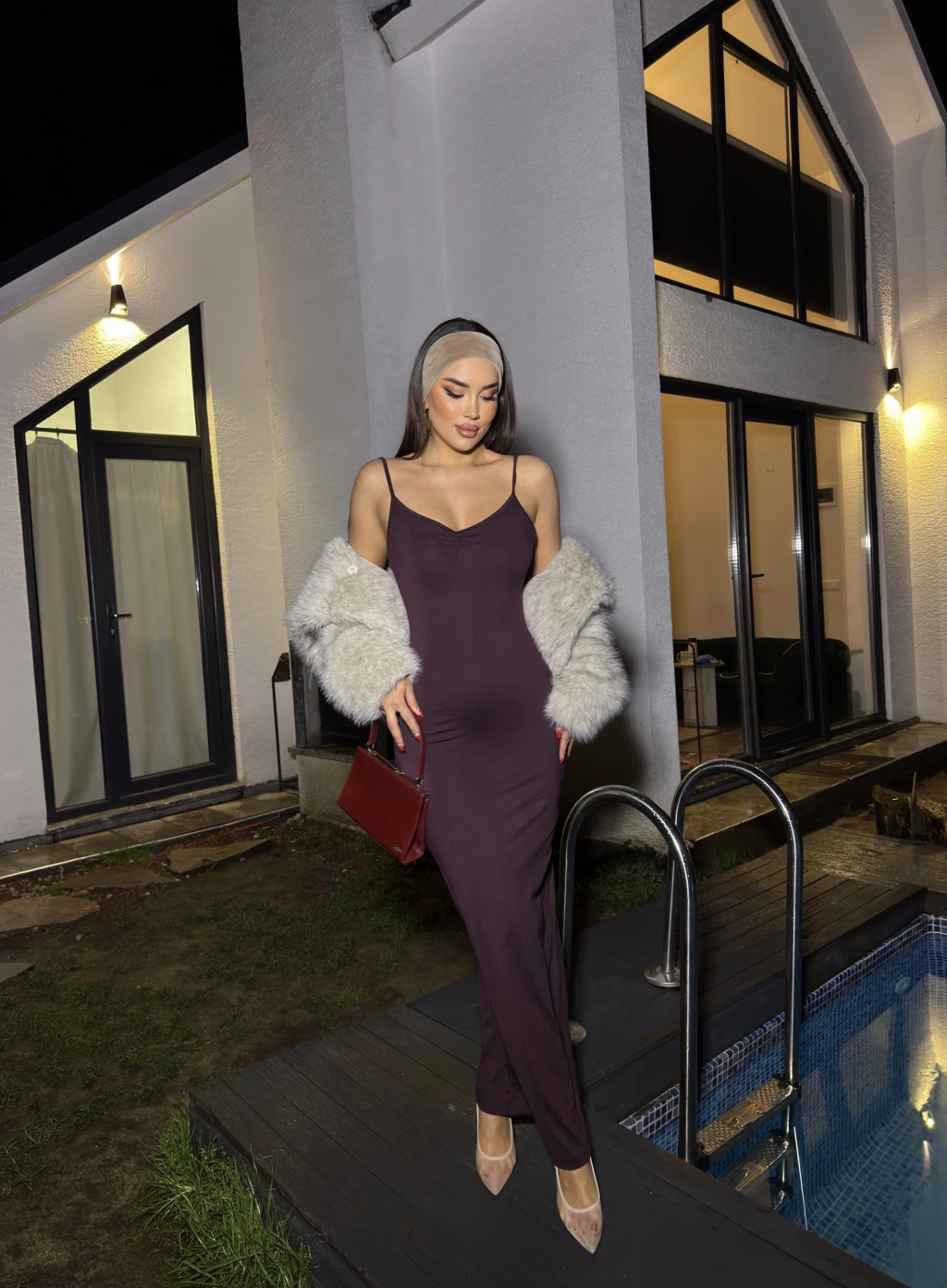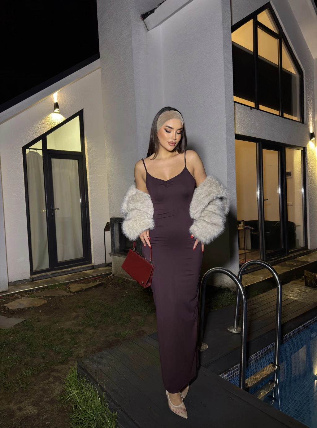 Mürdüm Askılı Göğüs Büzgü Uzun Elbise
