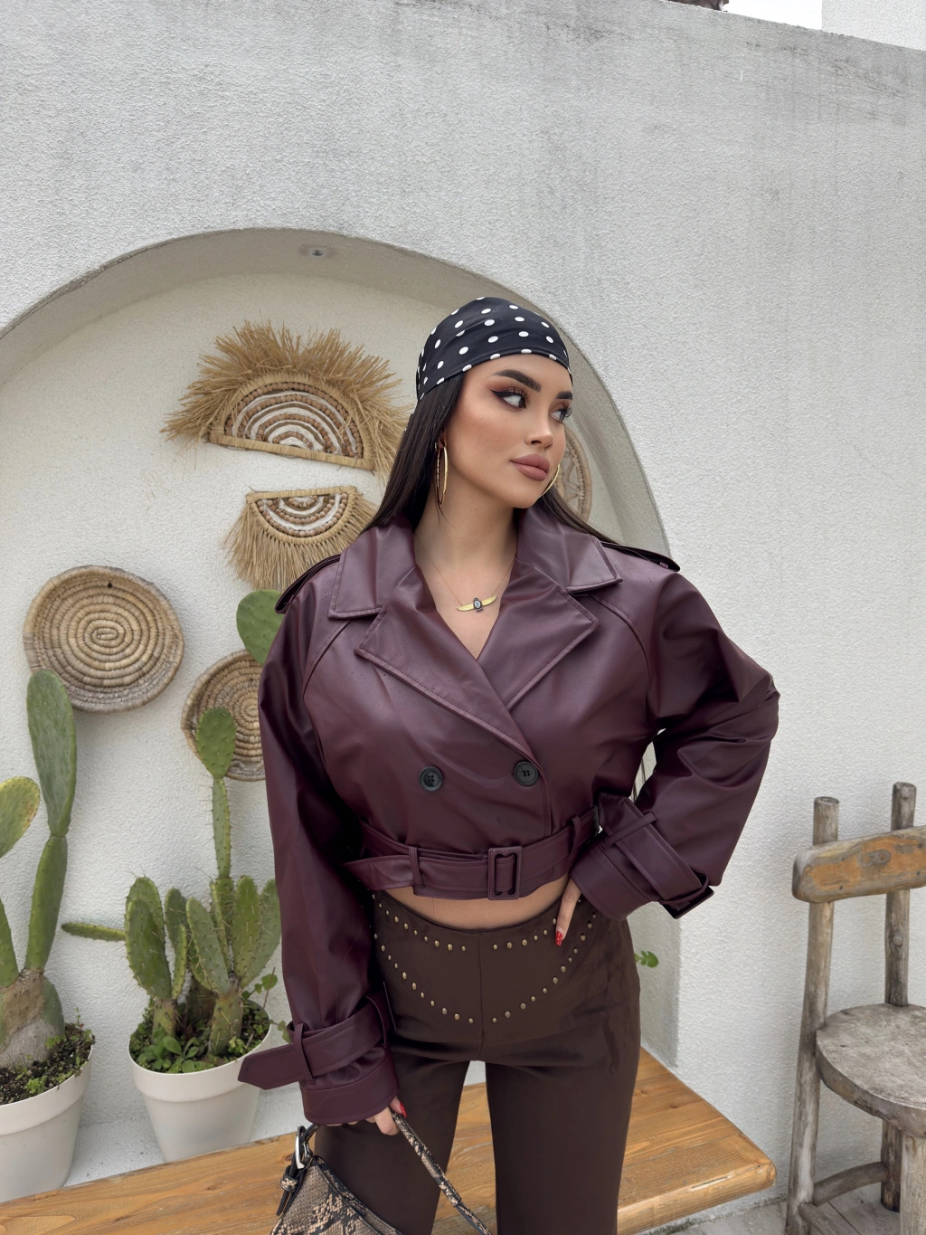 Bordo Crop Kemerli Deri Ceket