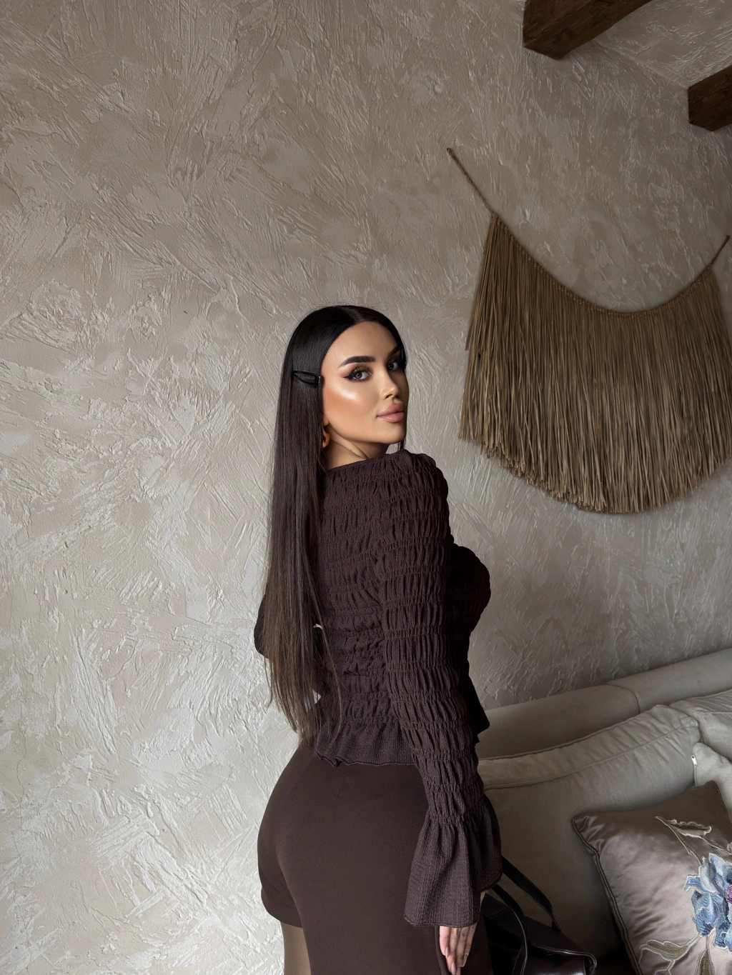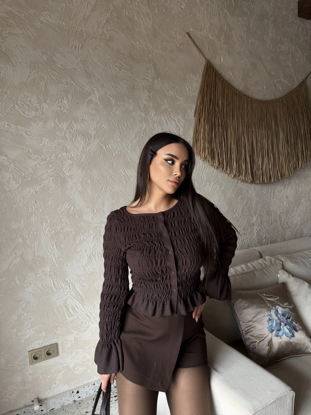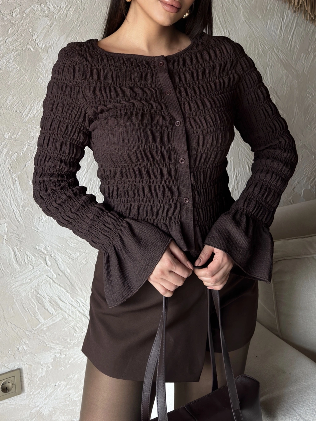 Kahverengi Düğmeli Gipeli Bluz