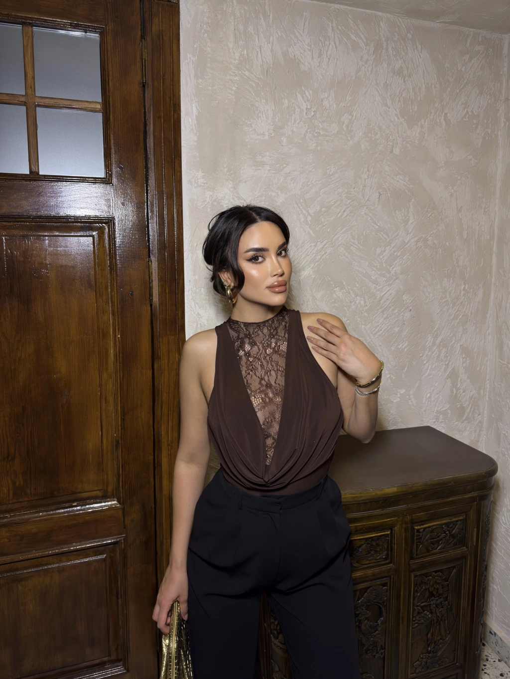 Kahverengi Dantel Detay Derin Degaje Bodysuit