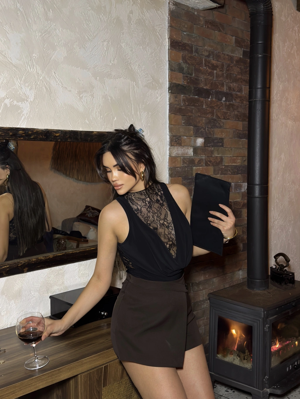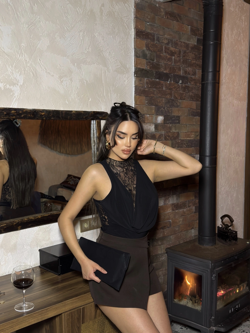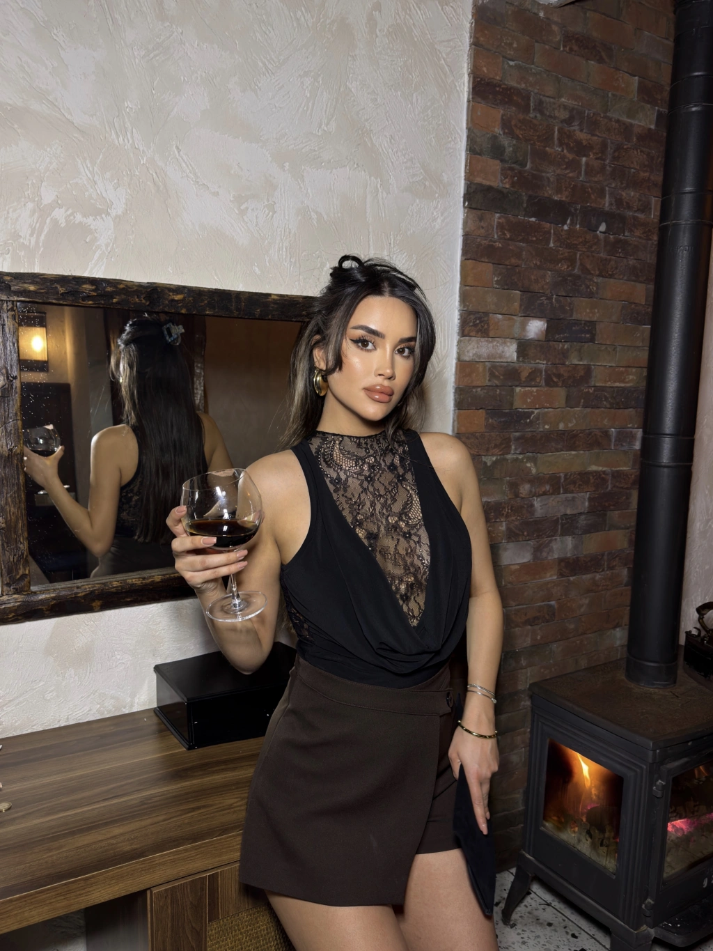 Siyah Dantel Detay Derin Degaje Bodysuit