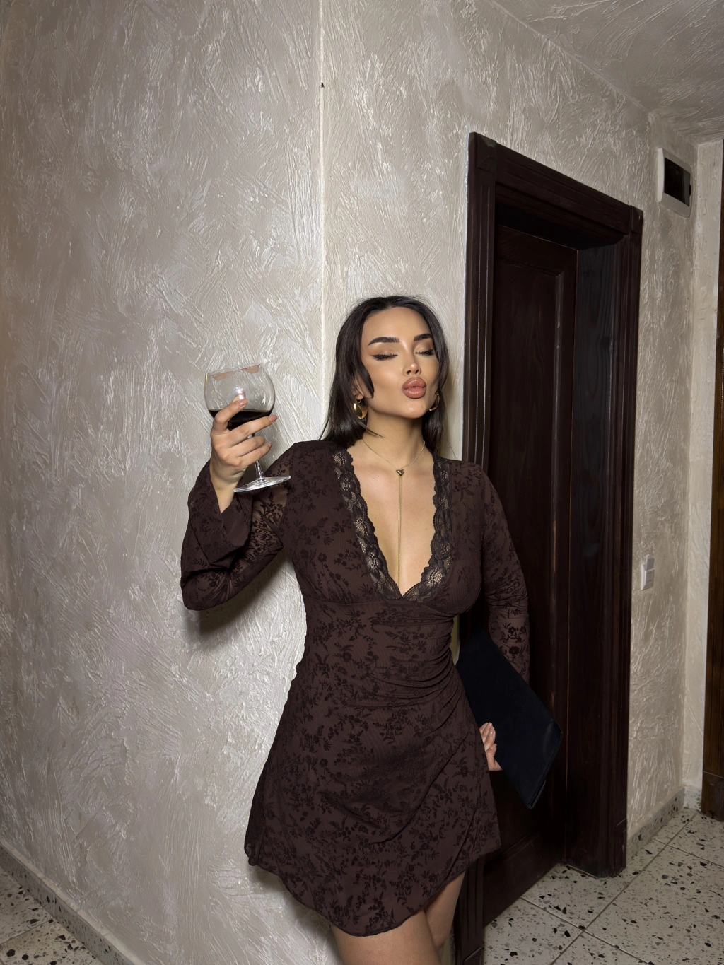 Kahverengi V Yaka Güpürlü Mini Elbise