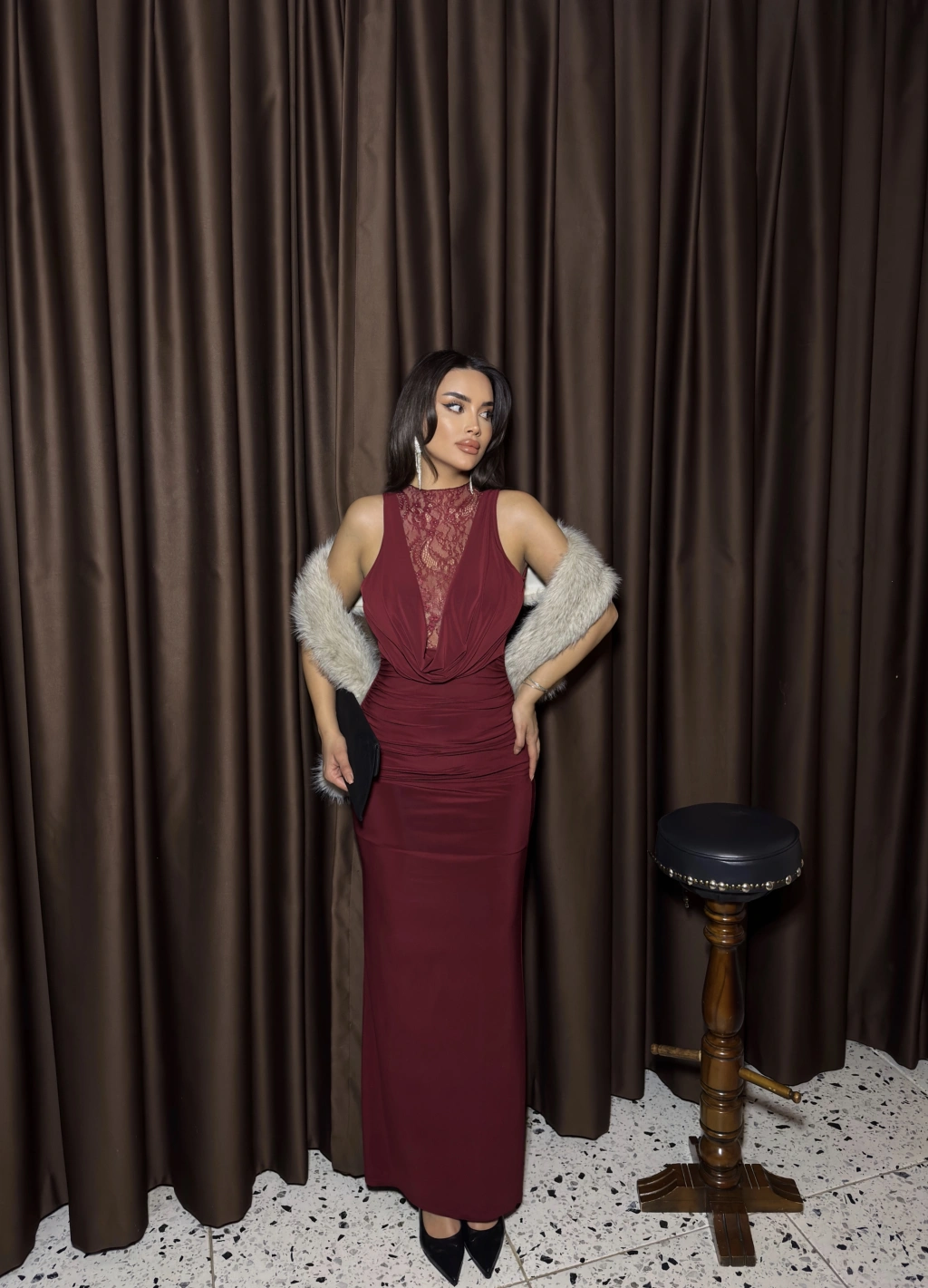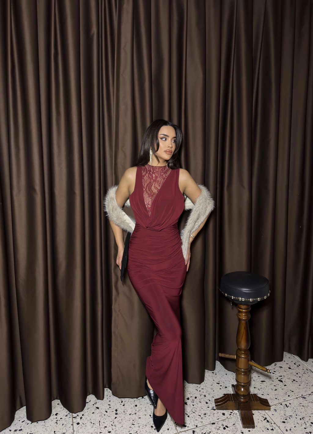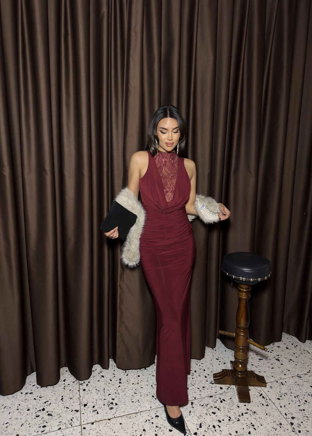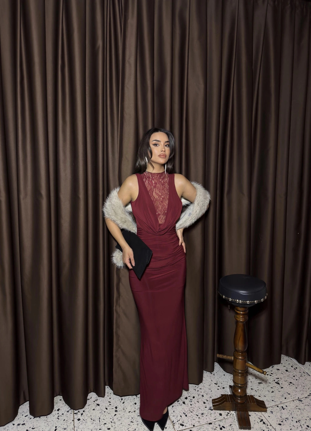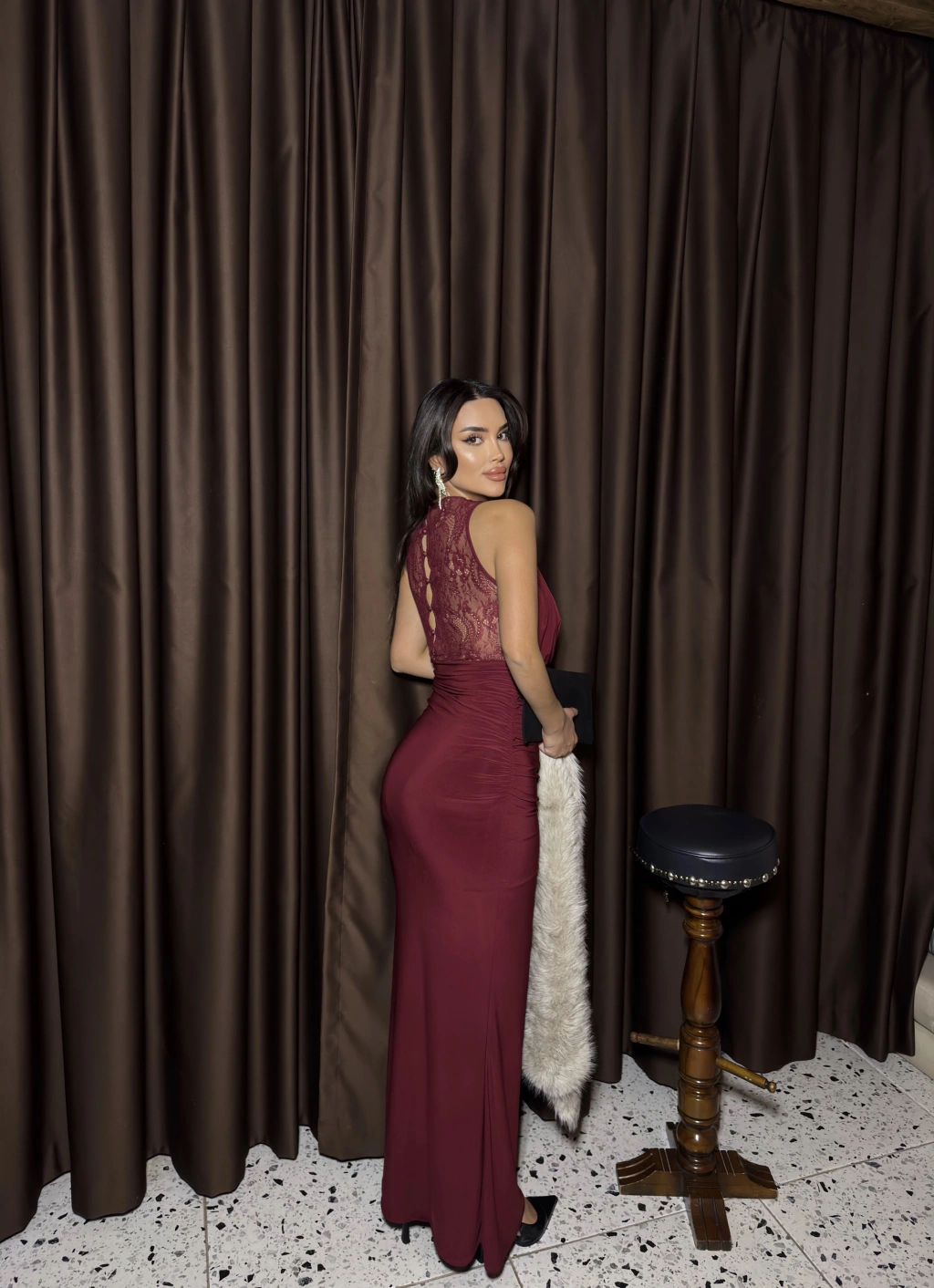Bordo Dantel Detay Derin Degaje Yaka Elbise