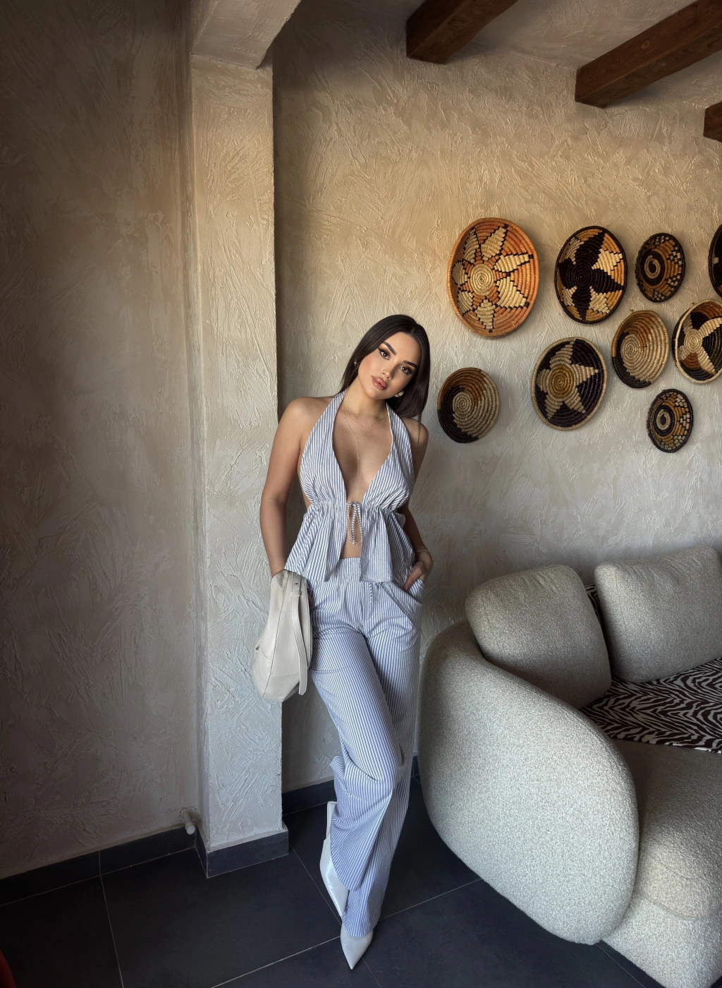 Siyah Çizgili Desen Boyundan Bağlamalı Takım