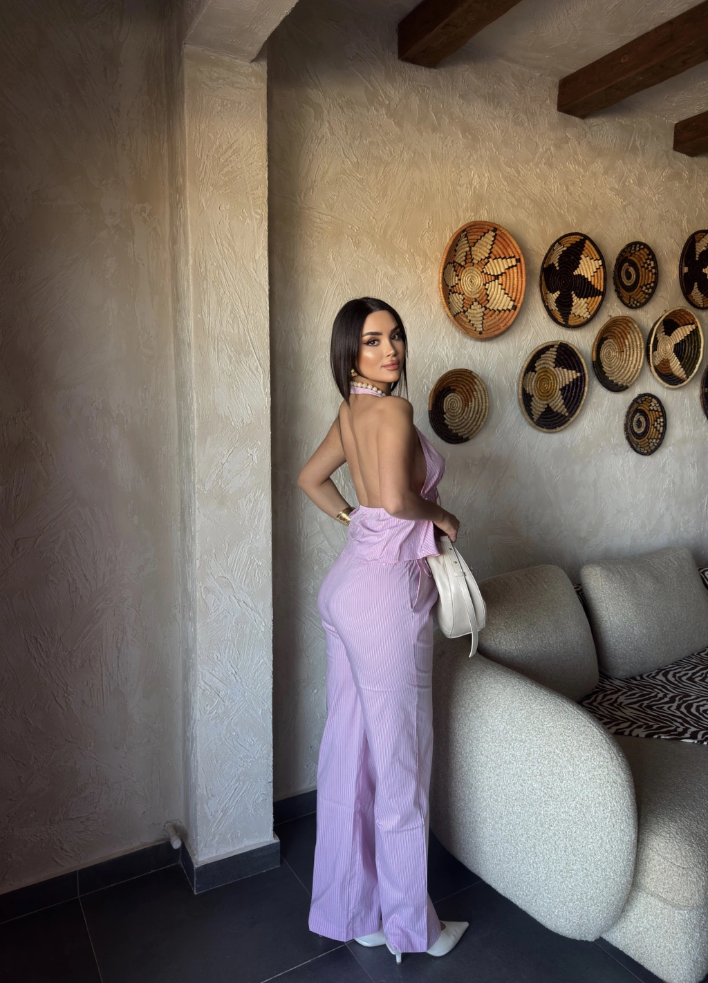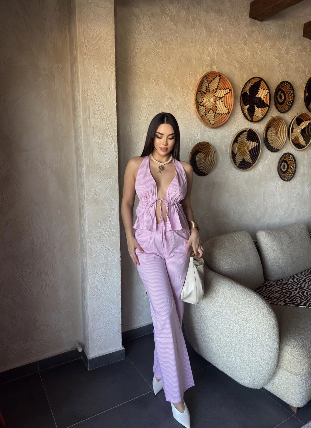 Pembe Çizgili Desen Boyundan Bağlamalı Takım