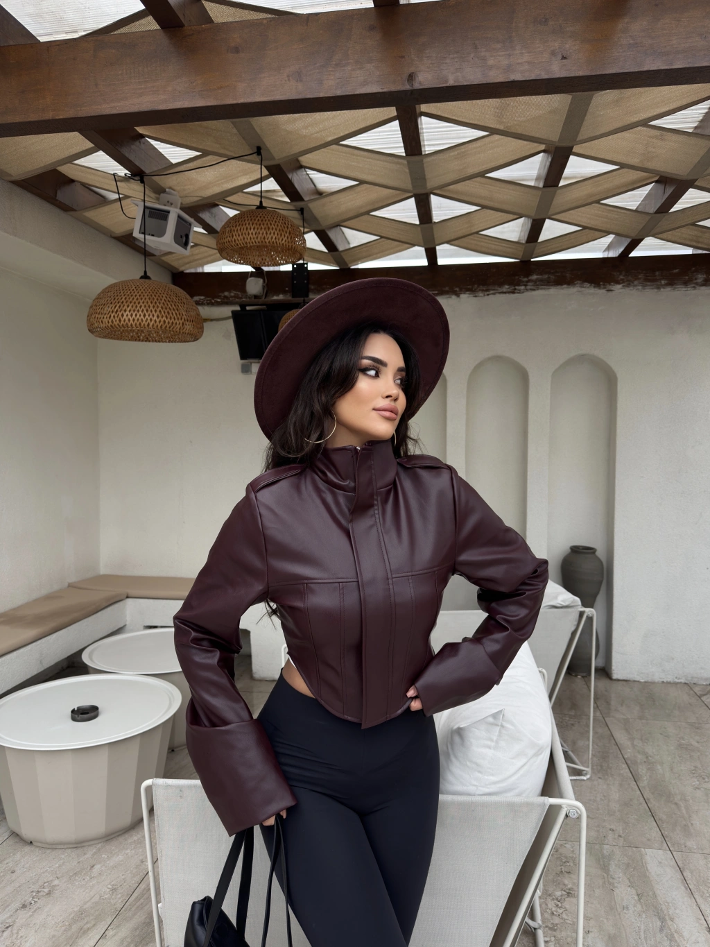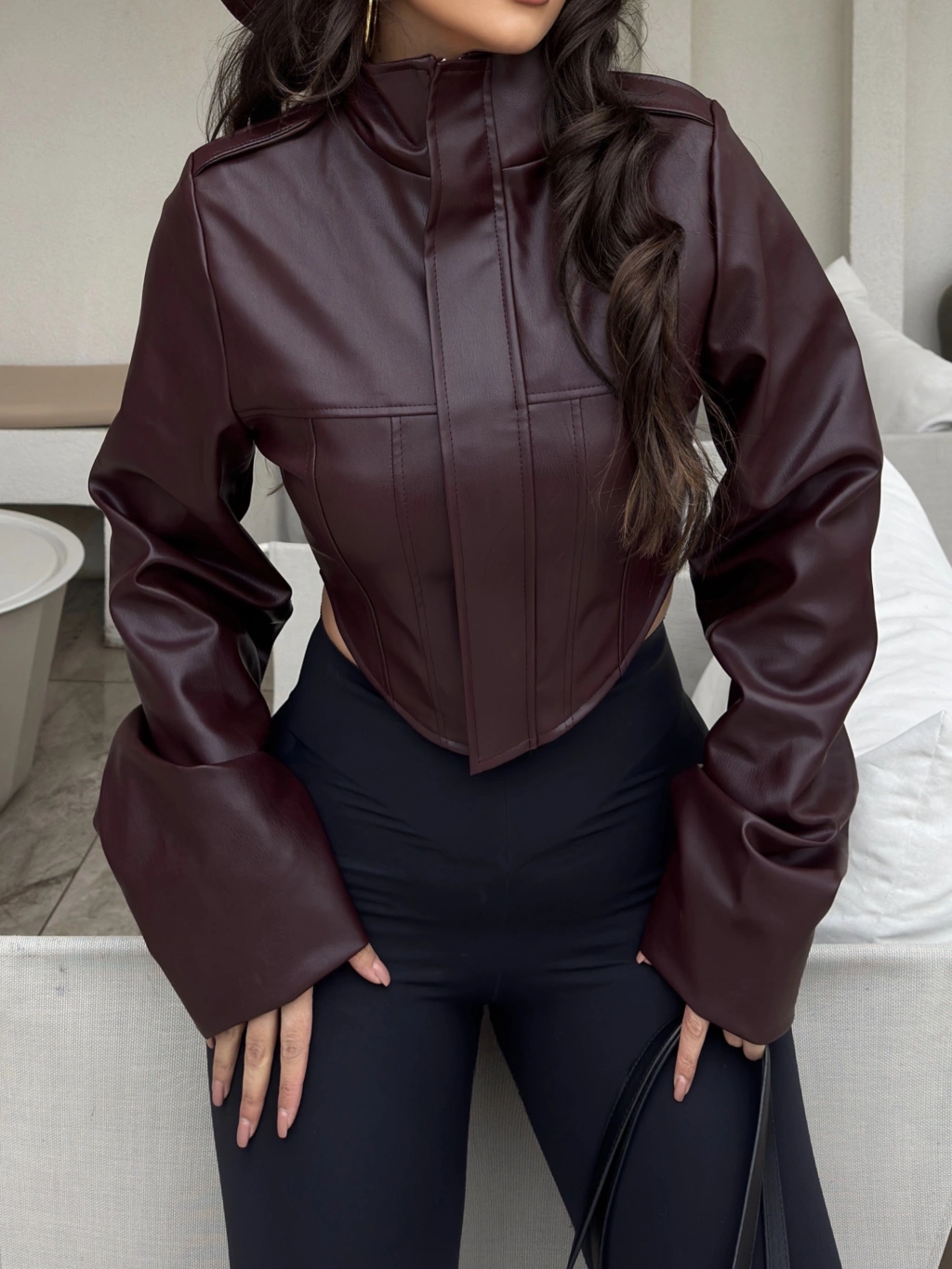 Bordo Korse Detay Dik Yaka Deri Ceket
