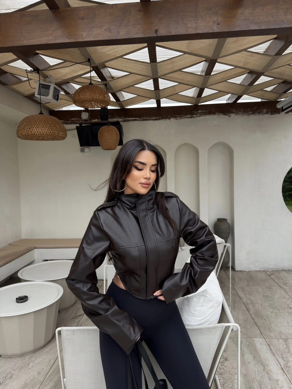 Acı Kahve Korse Detay Dik Yaka Deri Ceket