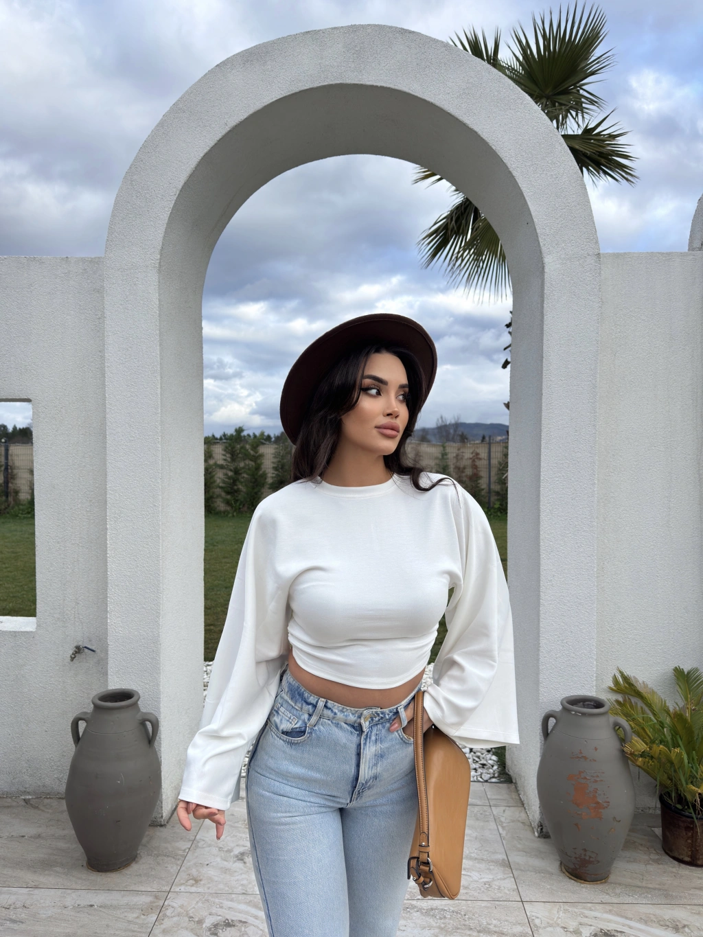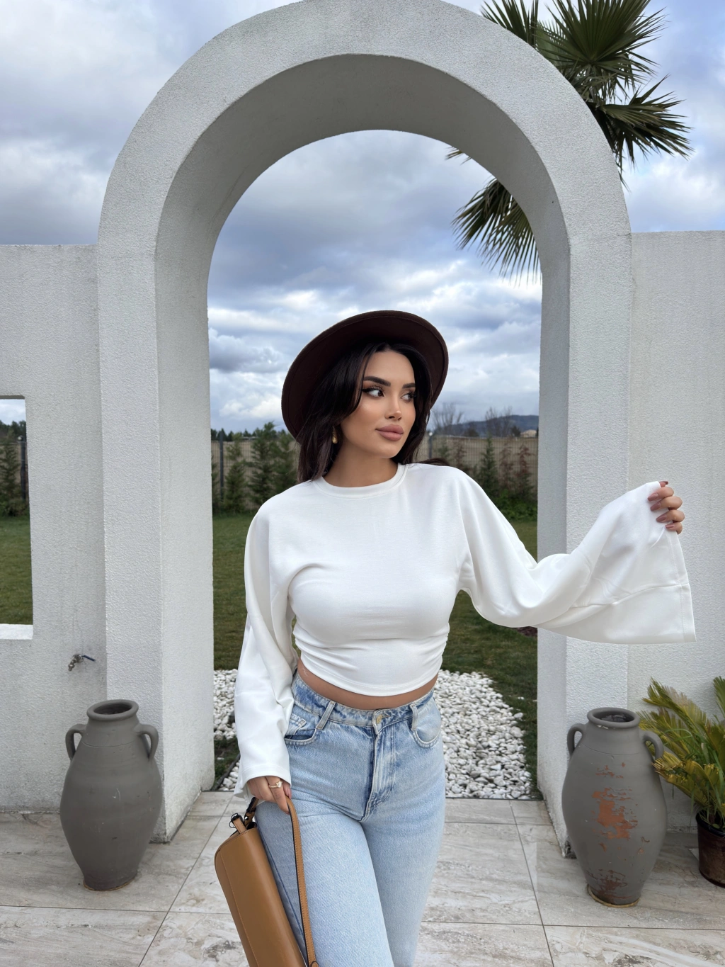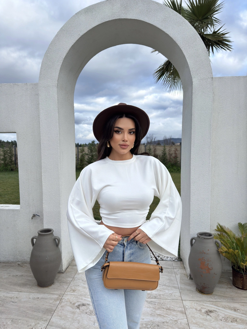 Beyaz Bisiklet Yaka İspanyol Kol Crop Tshırt