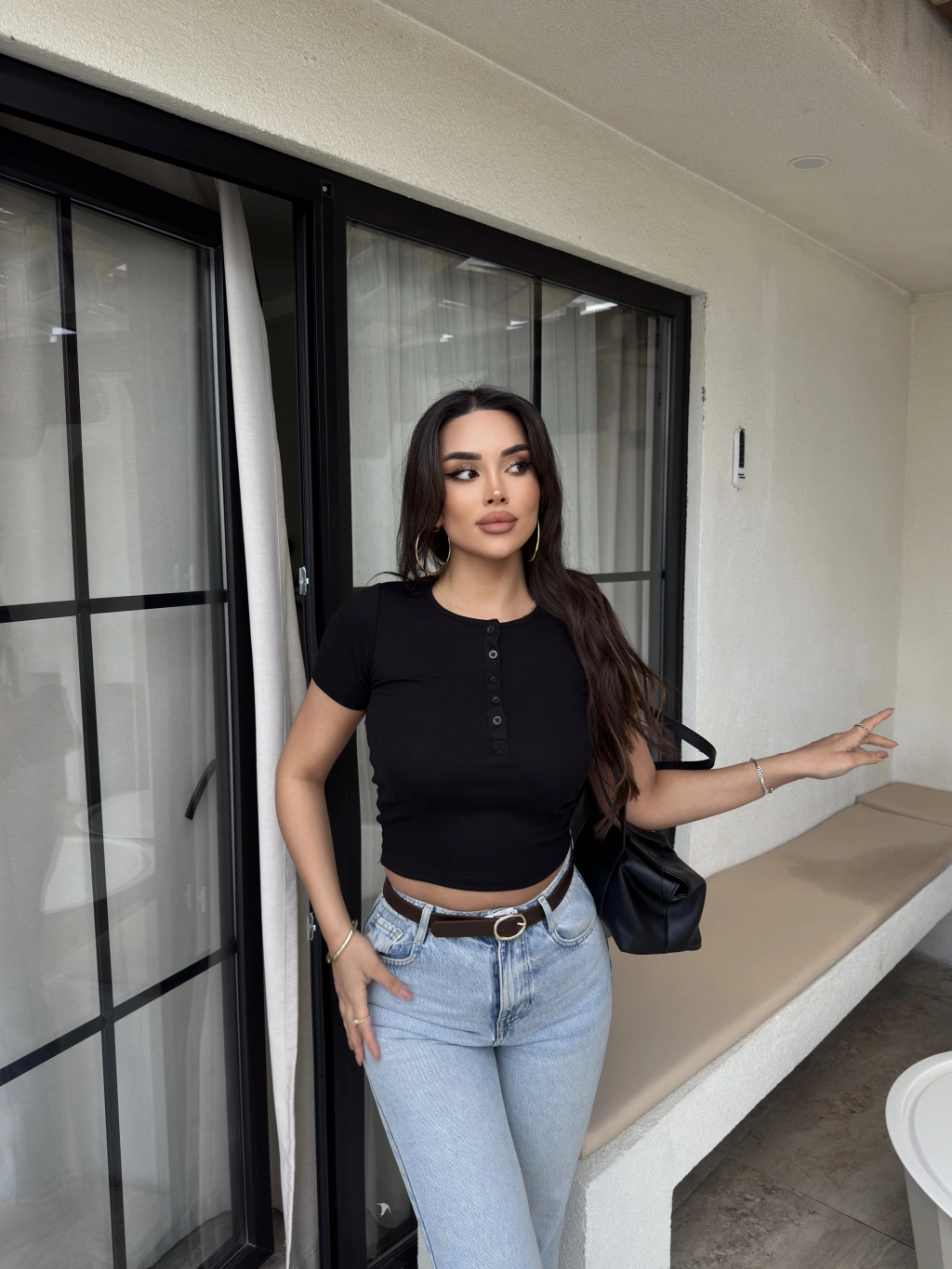 Siyah Düğme Detay Kısa Kol Crop