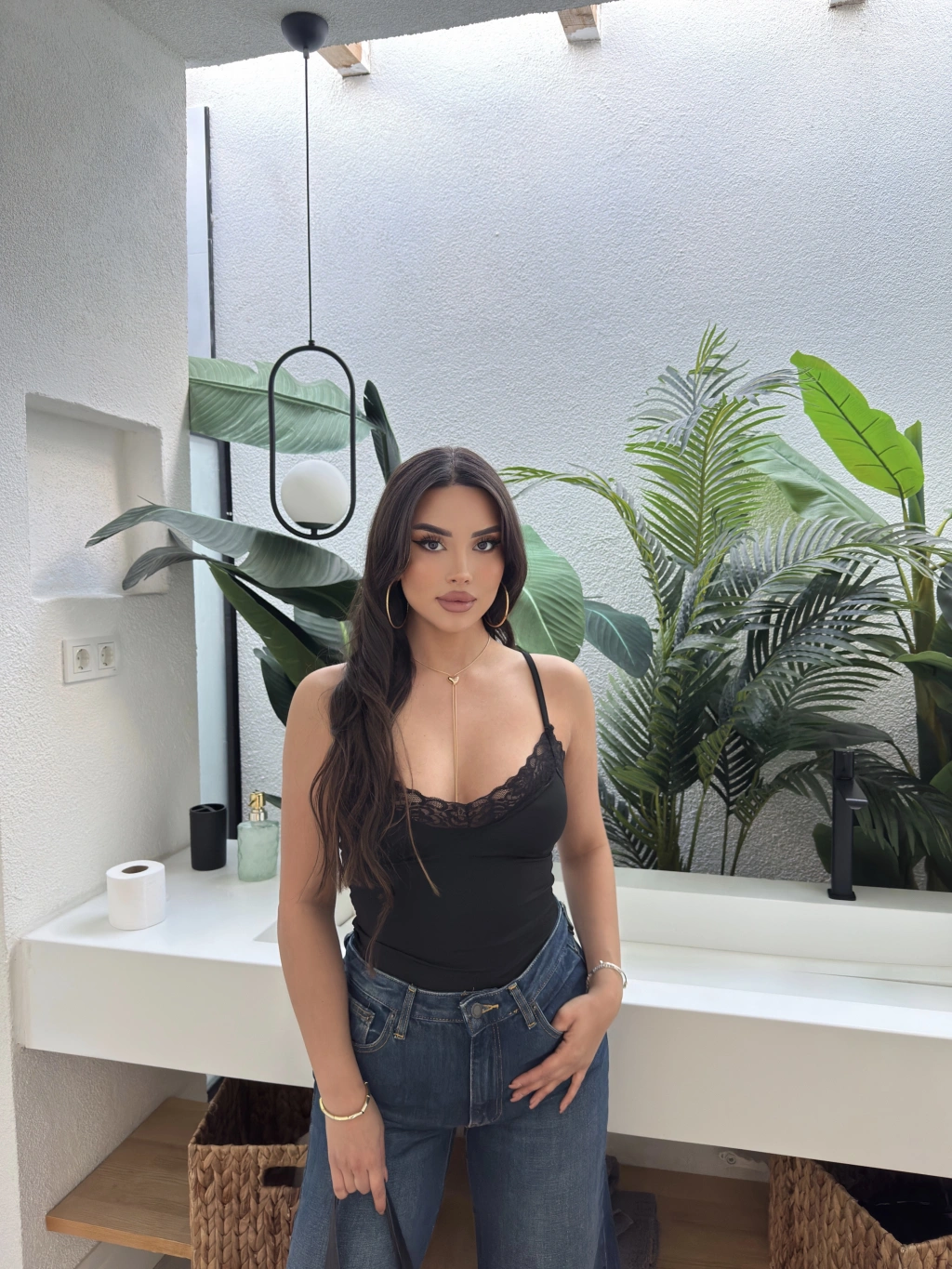 Siyah Askılı V Yaka Dantel Bluz
