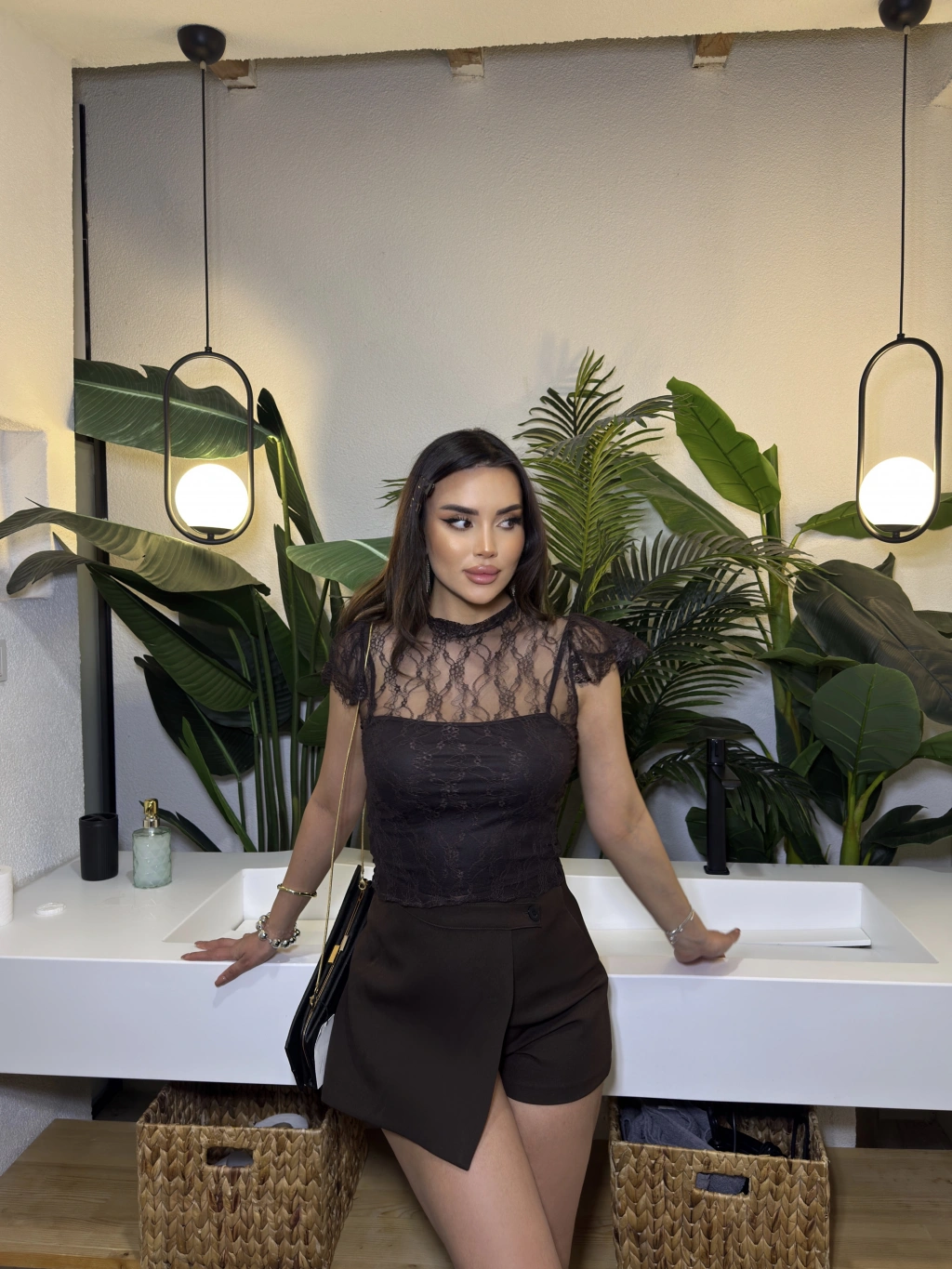 Kahverengi Dantel Detay Astarlı Bluz