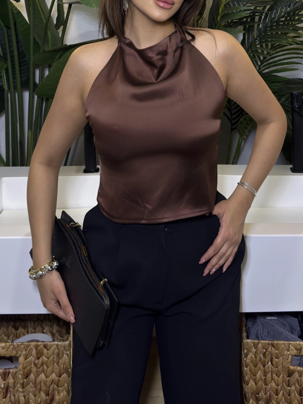 Kahverengi Saten Sırt Dekolteli Crop
