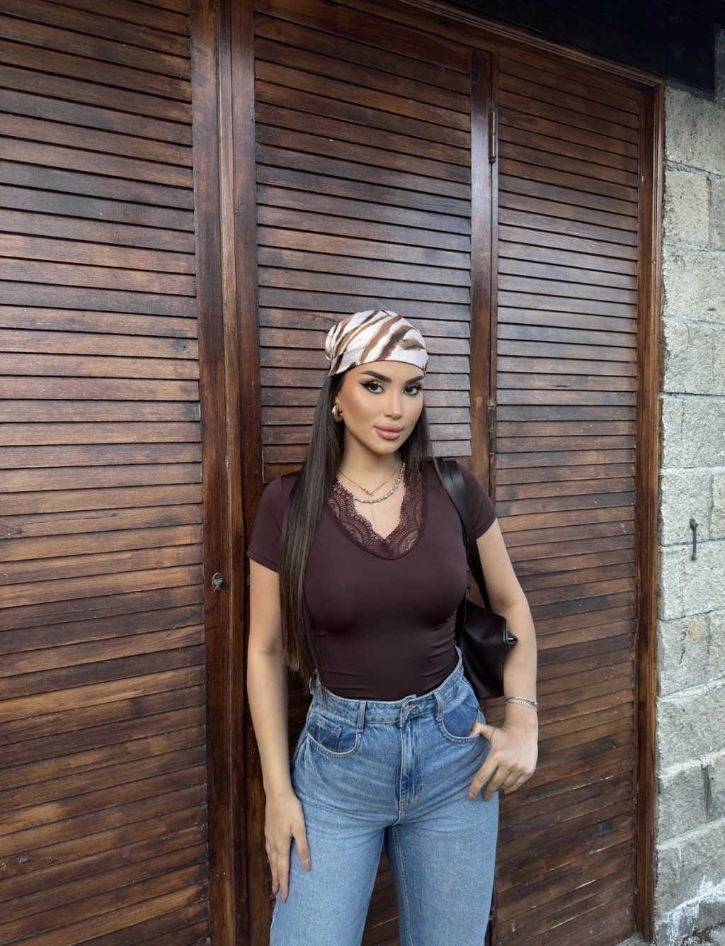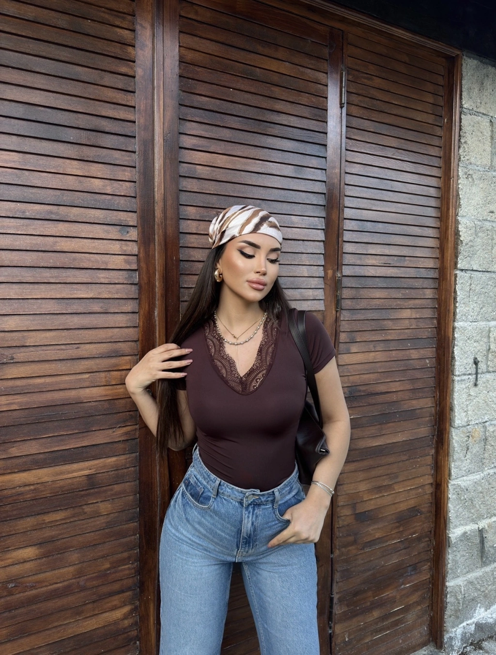 Kahverengi V Yaka Kısa Kol Dantel Bluz