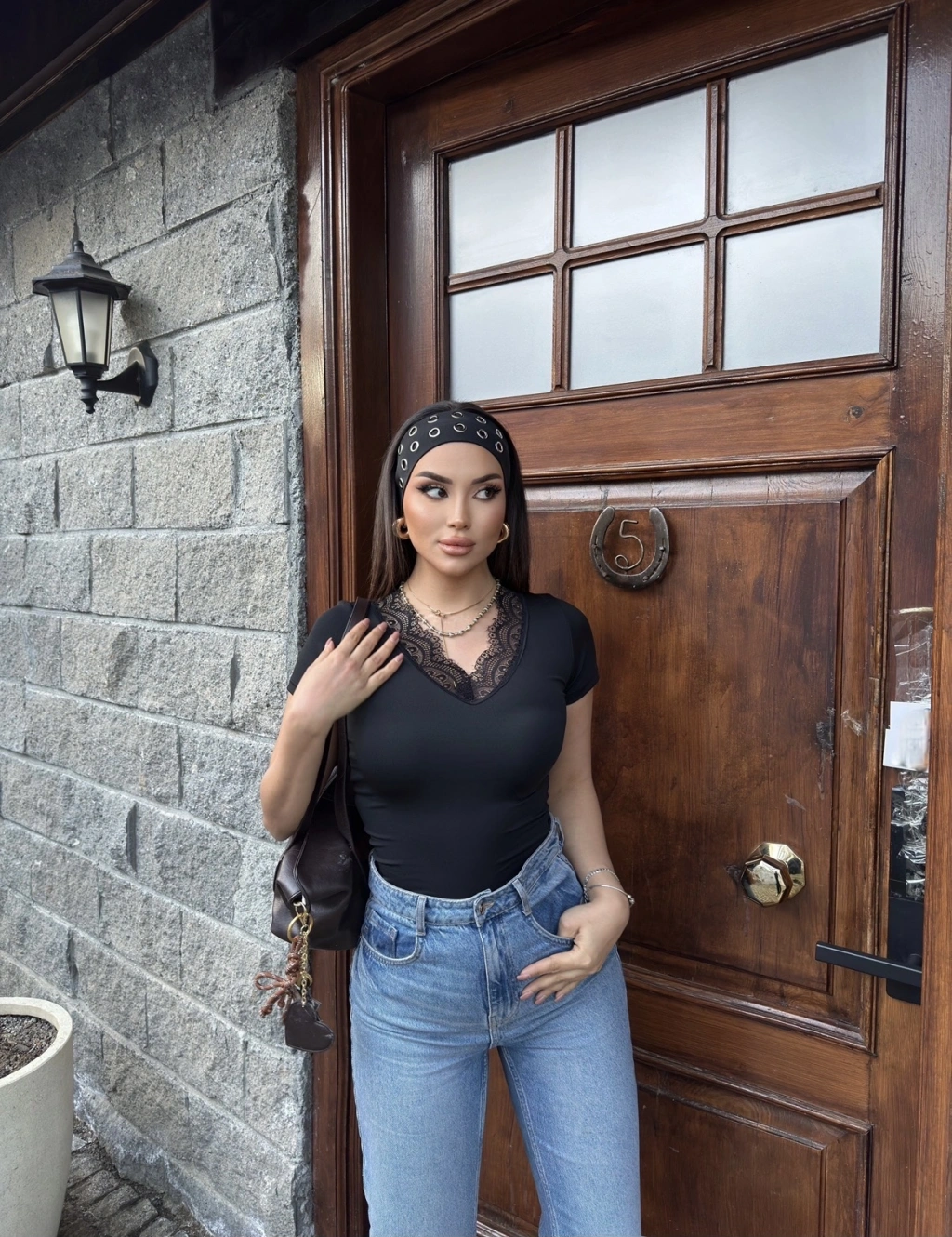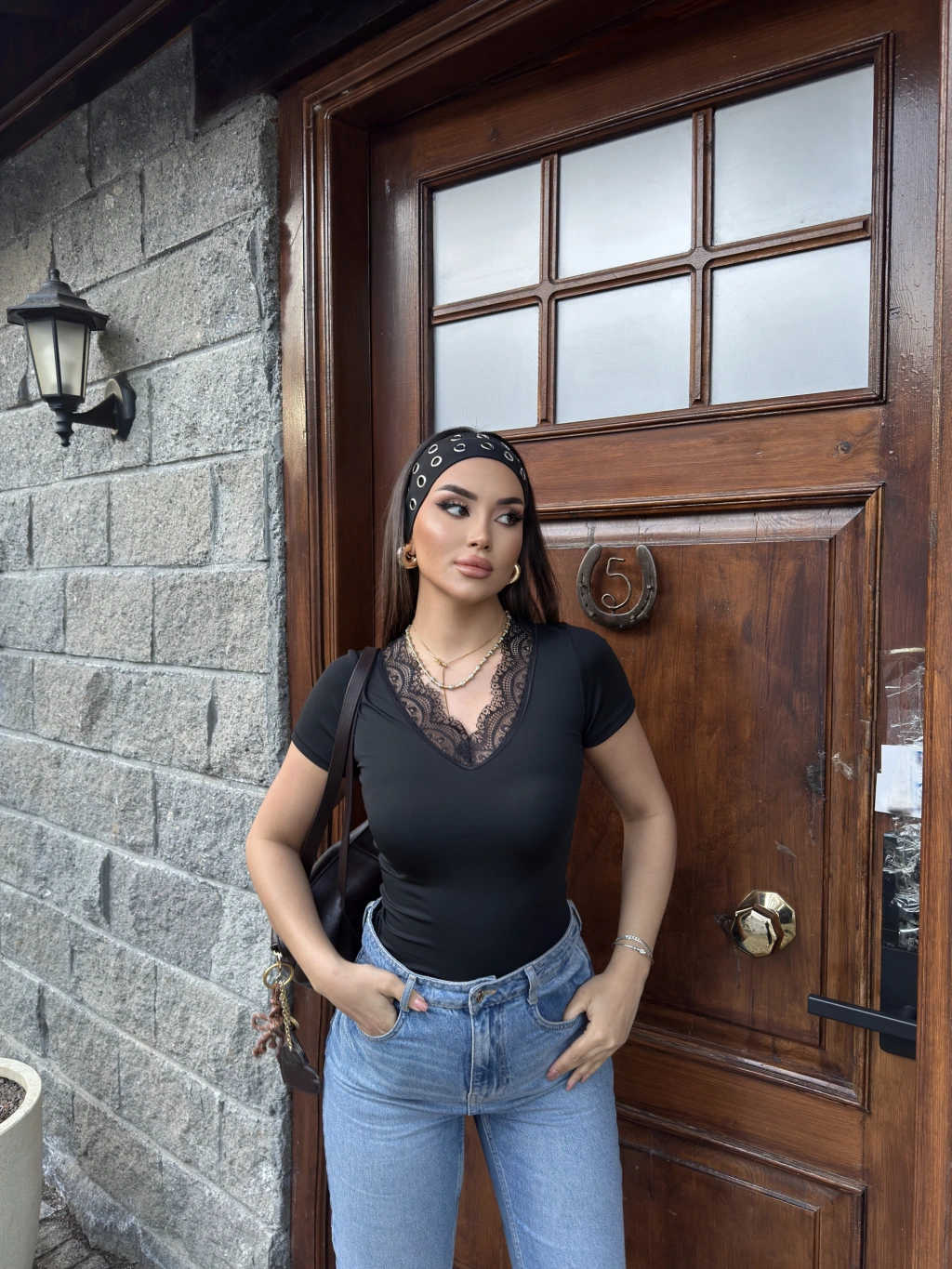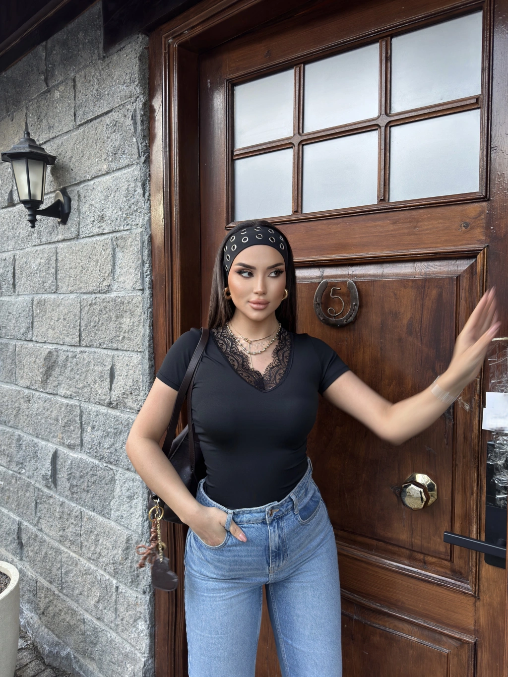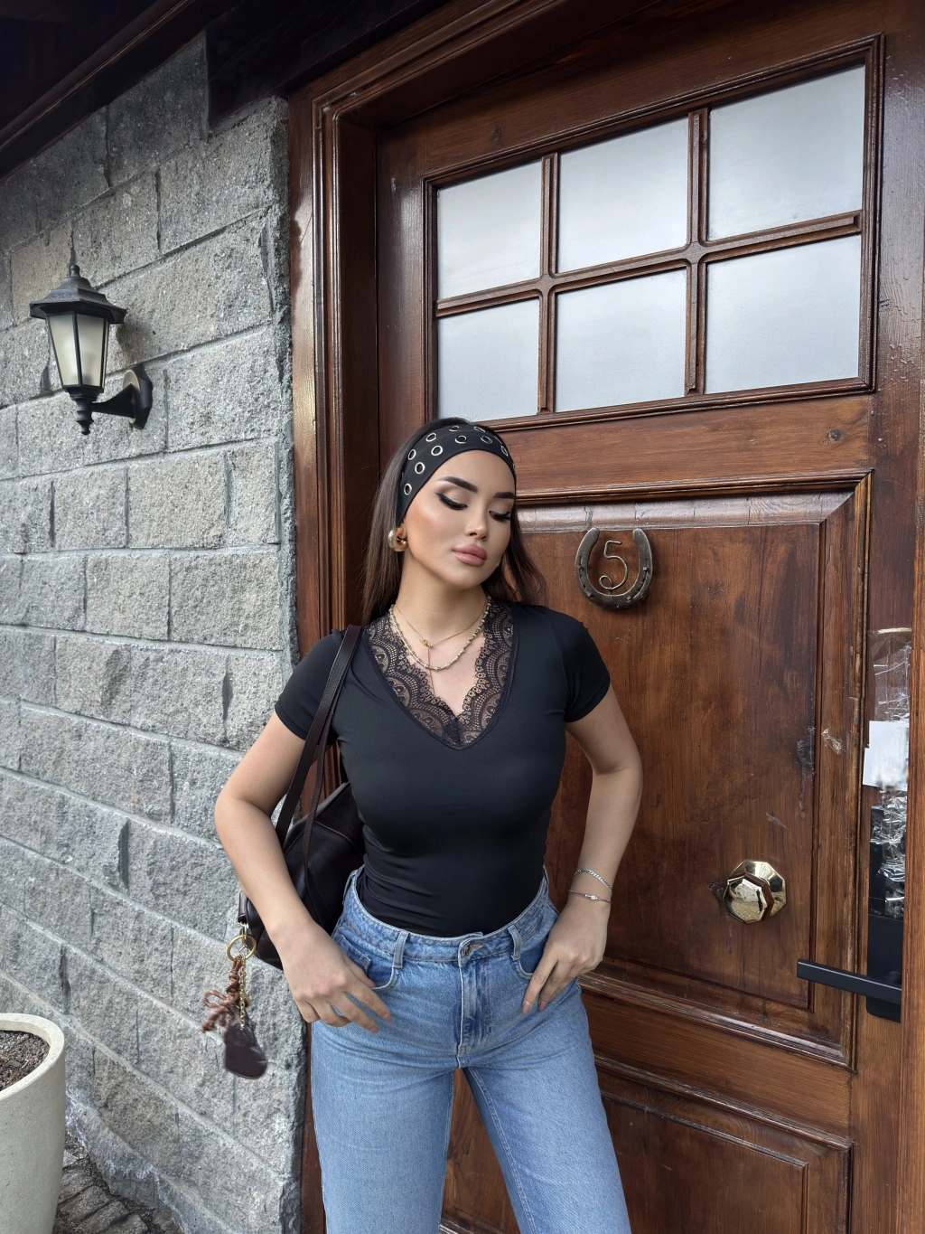 Siyah V Yaka Kısa Kol Dantel Bluz