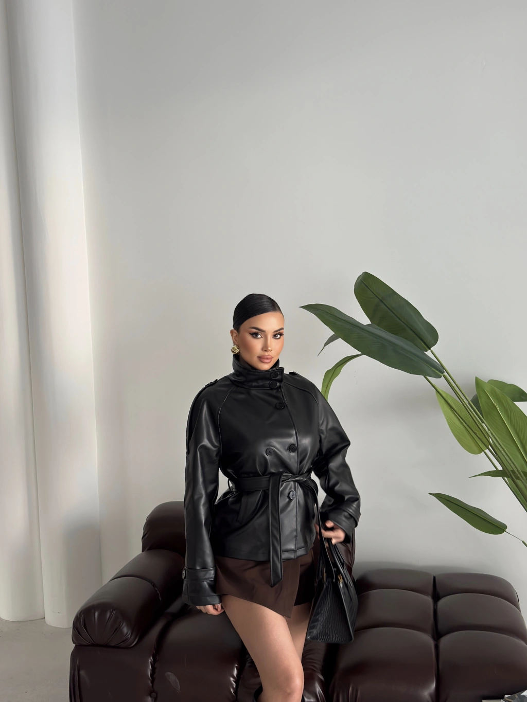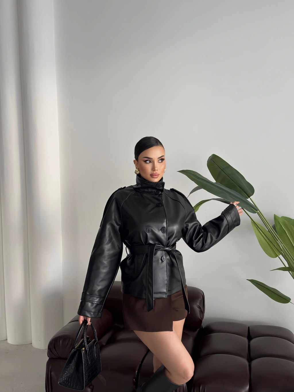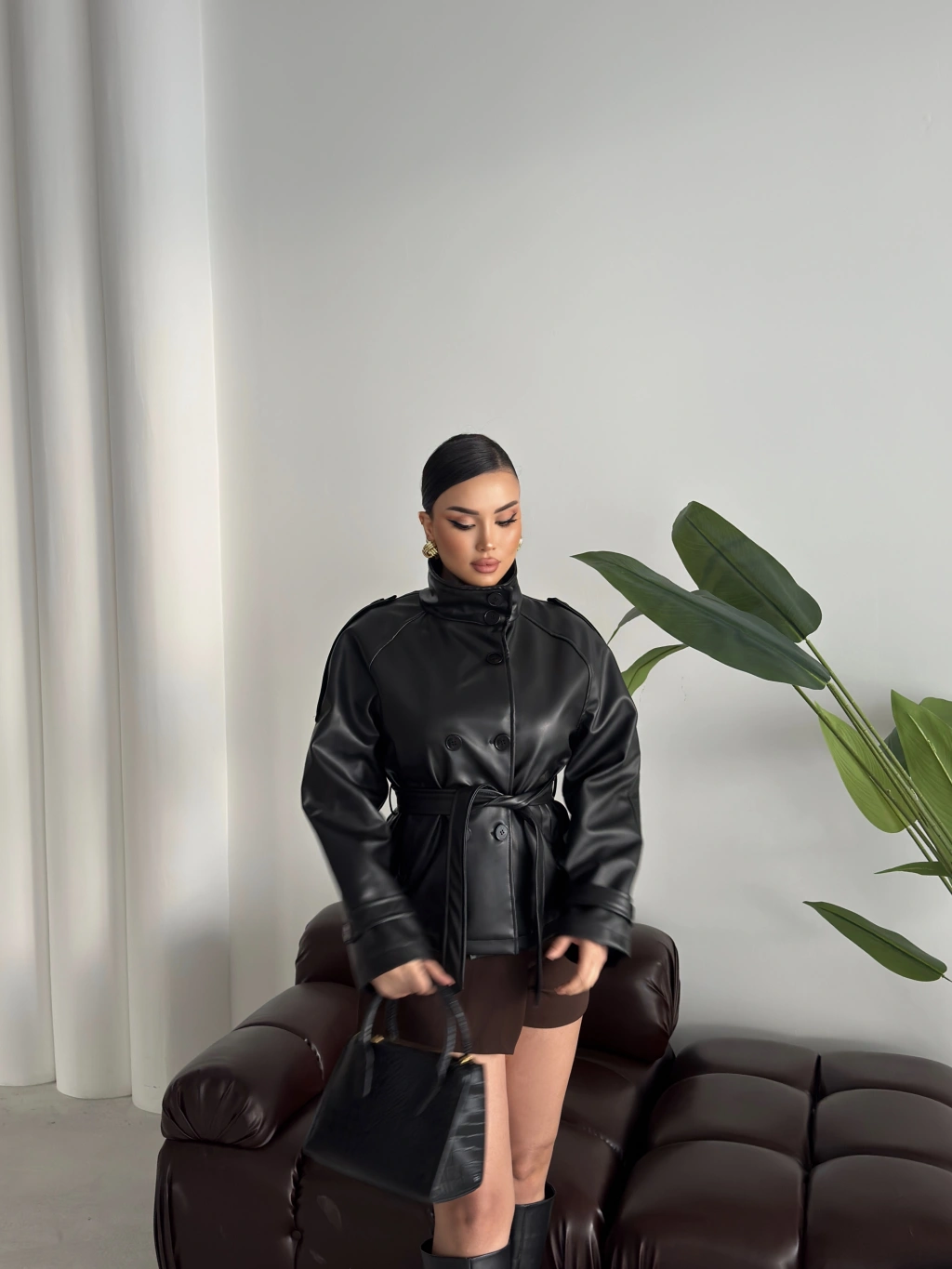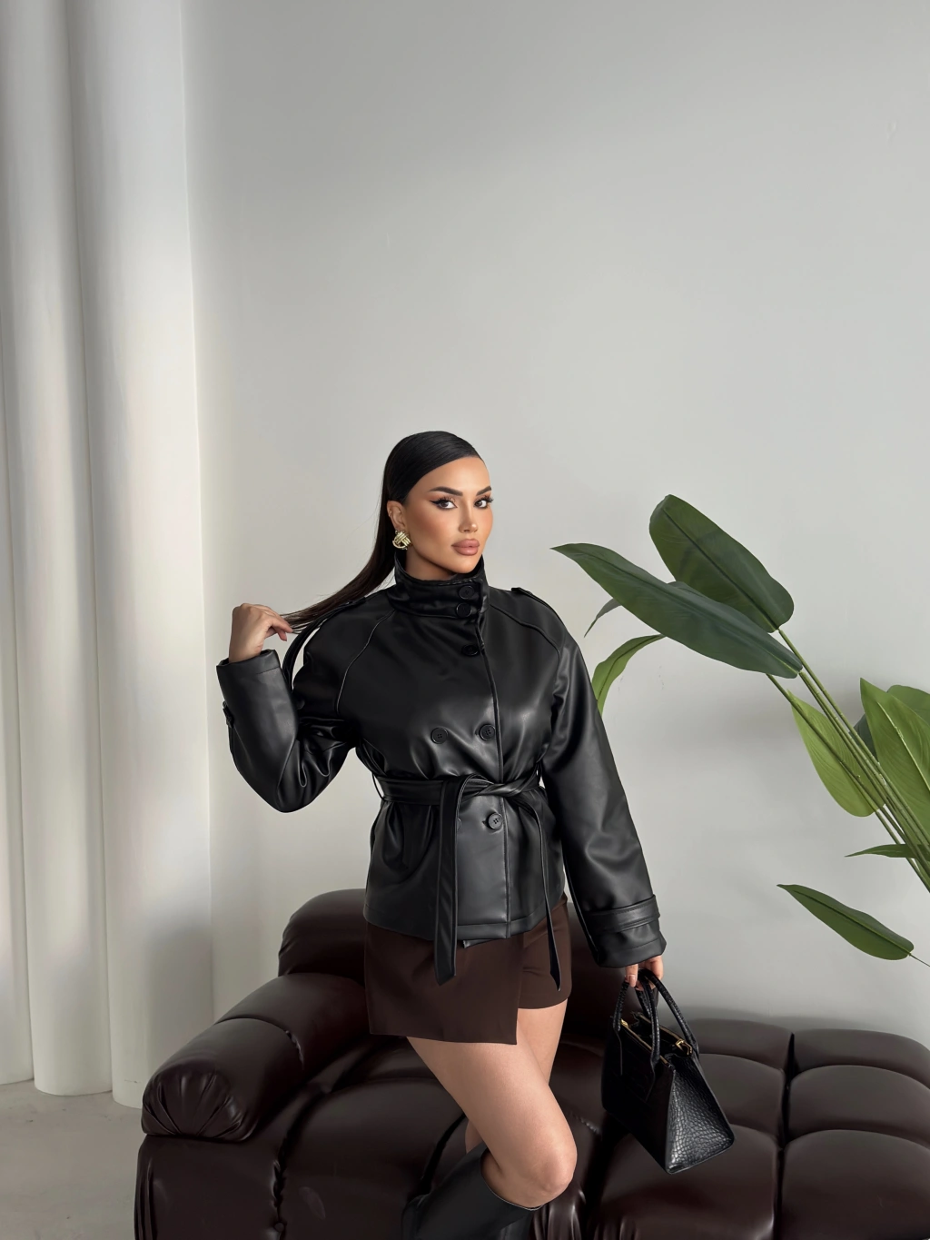 Siyah Kısa Suni Deri Dik Yaka Ceket