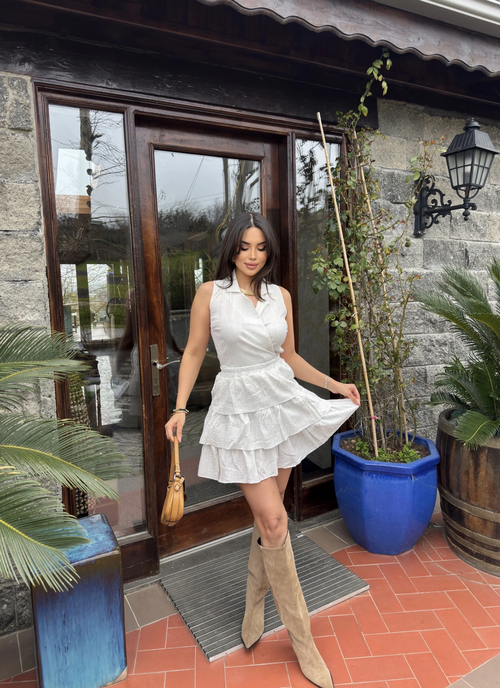 Ekru Gömlek Yaka Bağlamalı Kolsuz Etek Takım