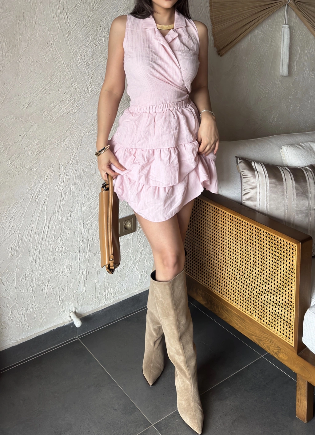 Pembe Gömlek Yaka Bağlamalı Kolsuz Etek Takım