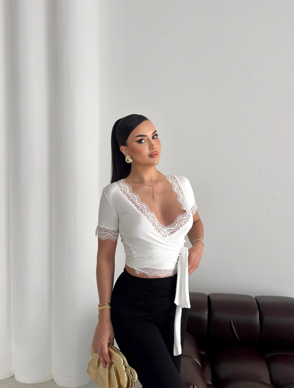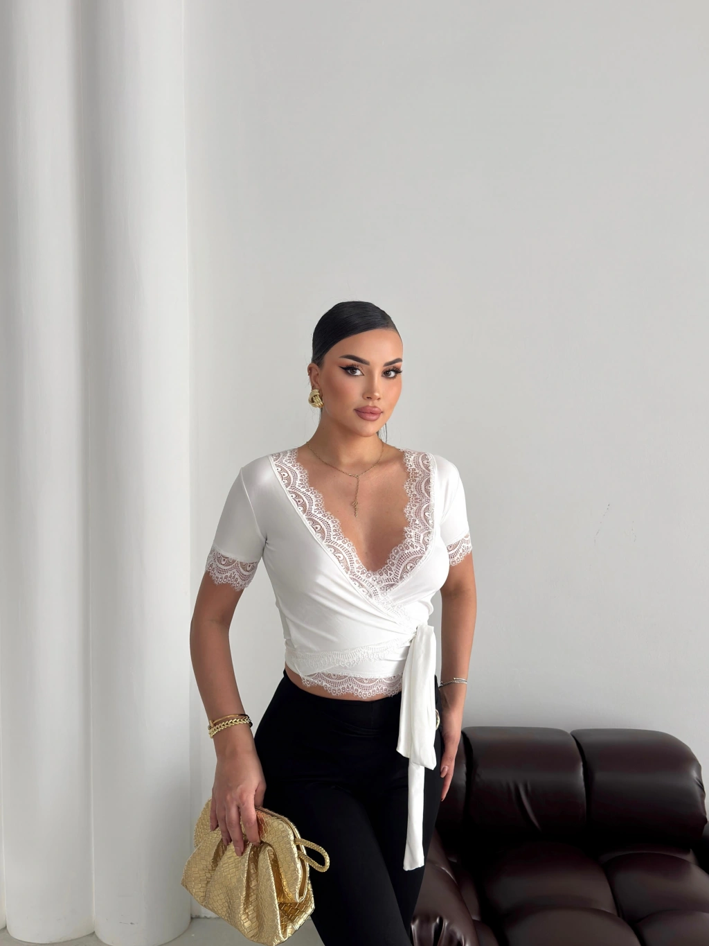Beyaz Kruvaze Bağlama Dantelli Crop