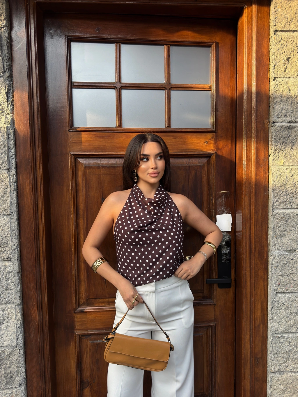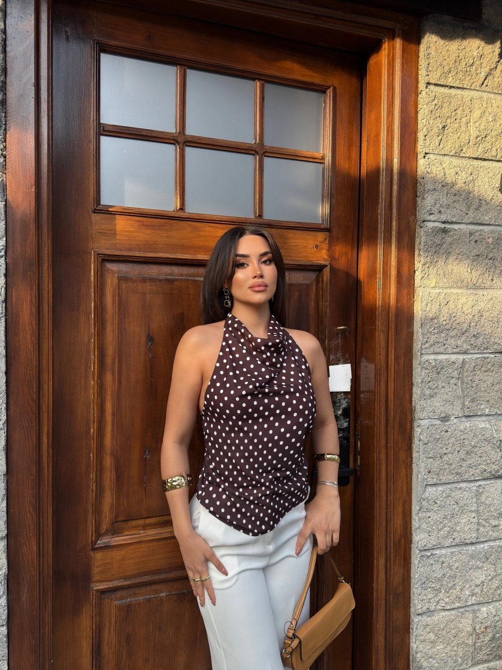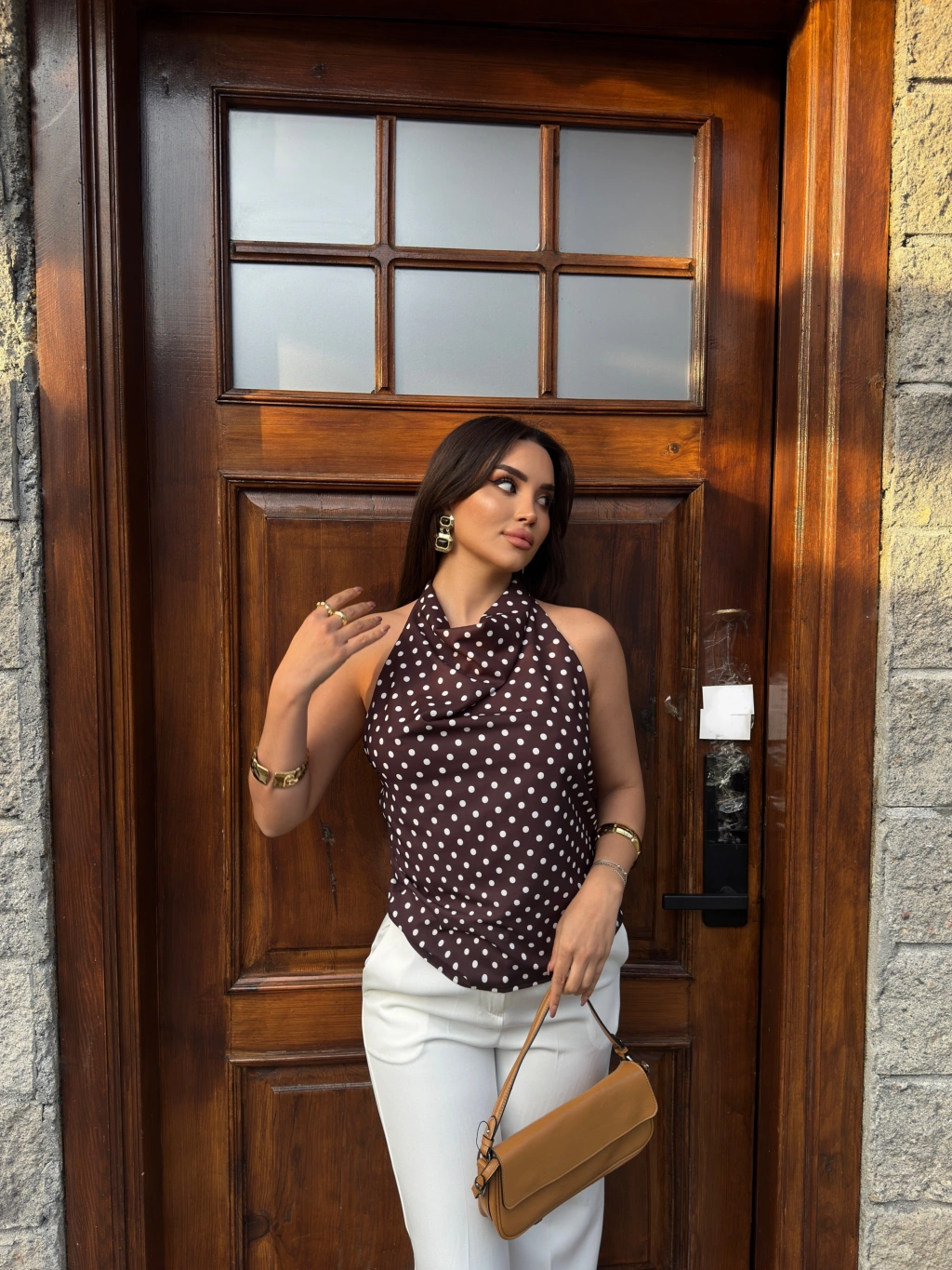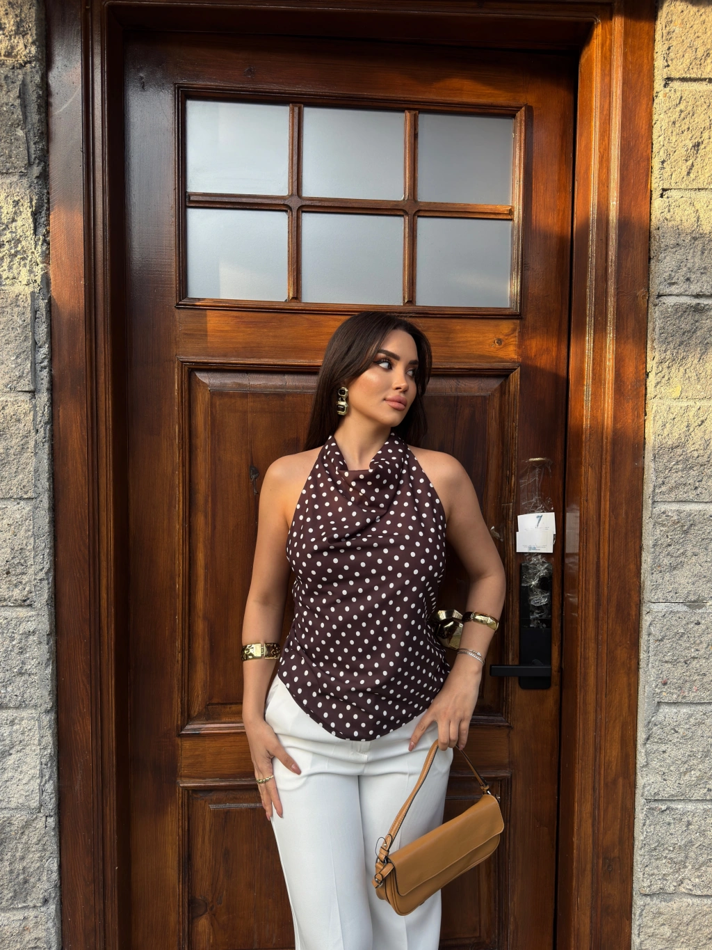 Kahverengi Puantiyeli Boyundan Geçirmeli Bluz