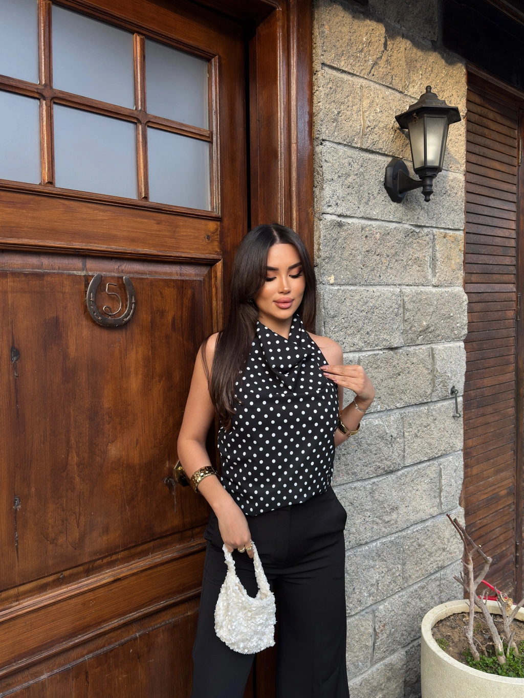 Siyah Puantiyeli Boyundan Geçirmeli Bluz