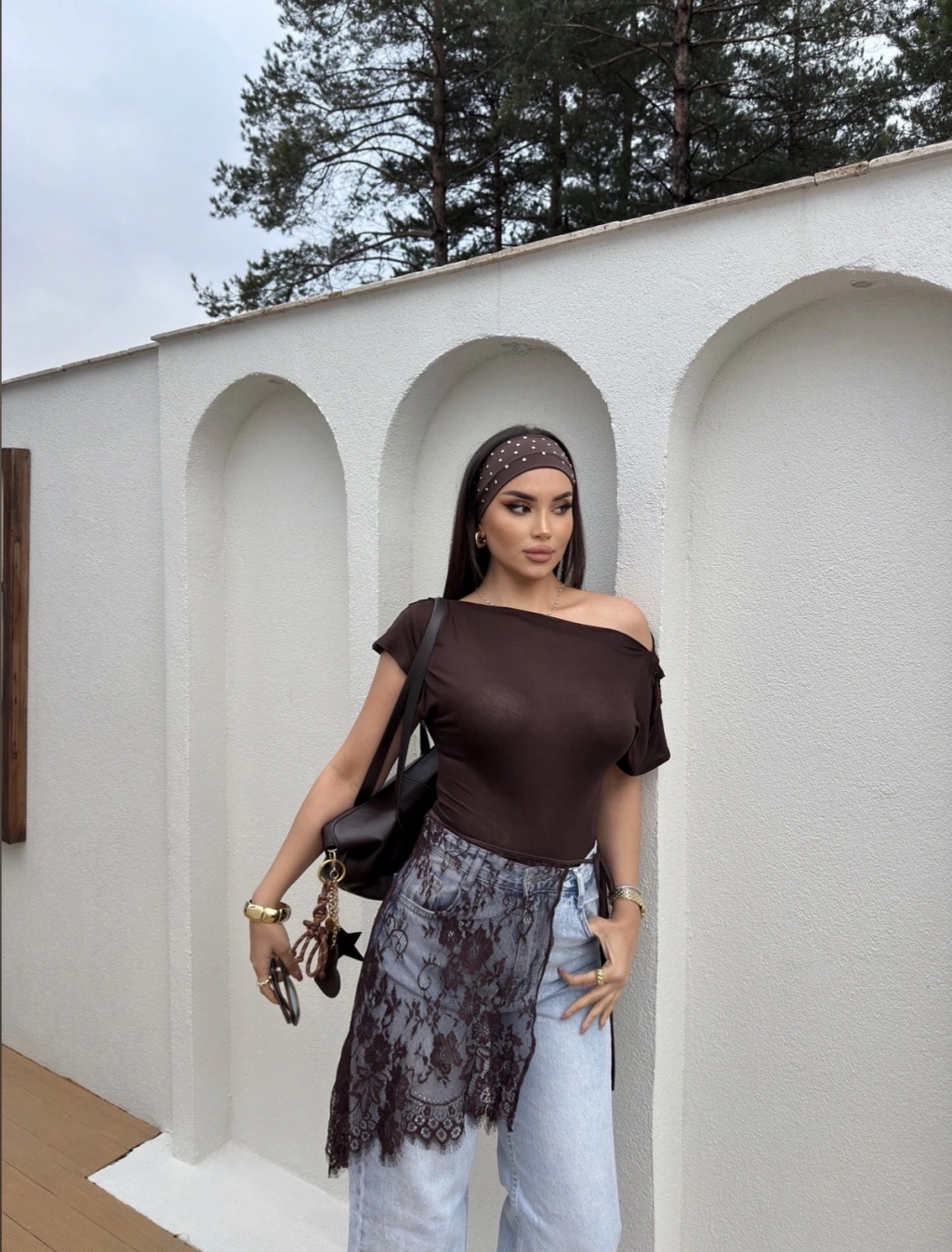 Kahverengi Kayık Yaka Transparan Bluz