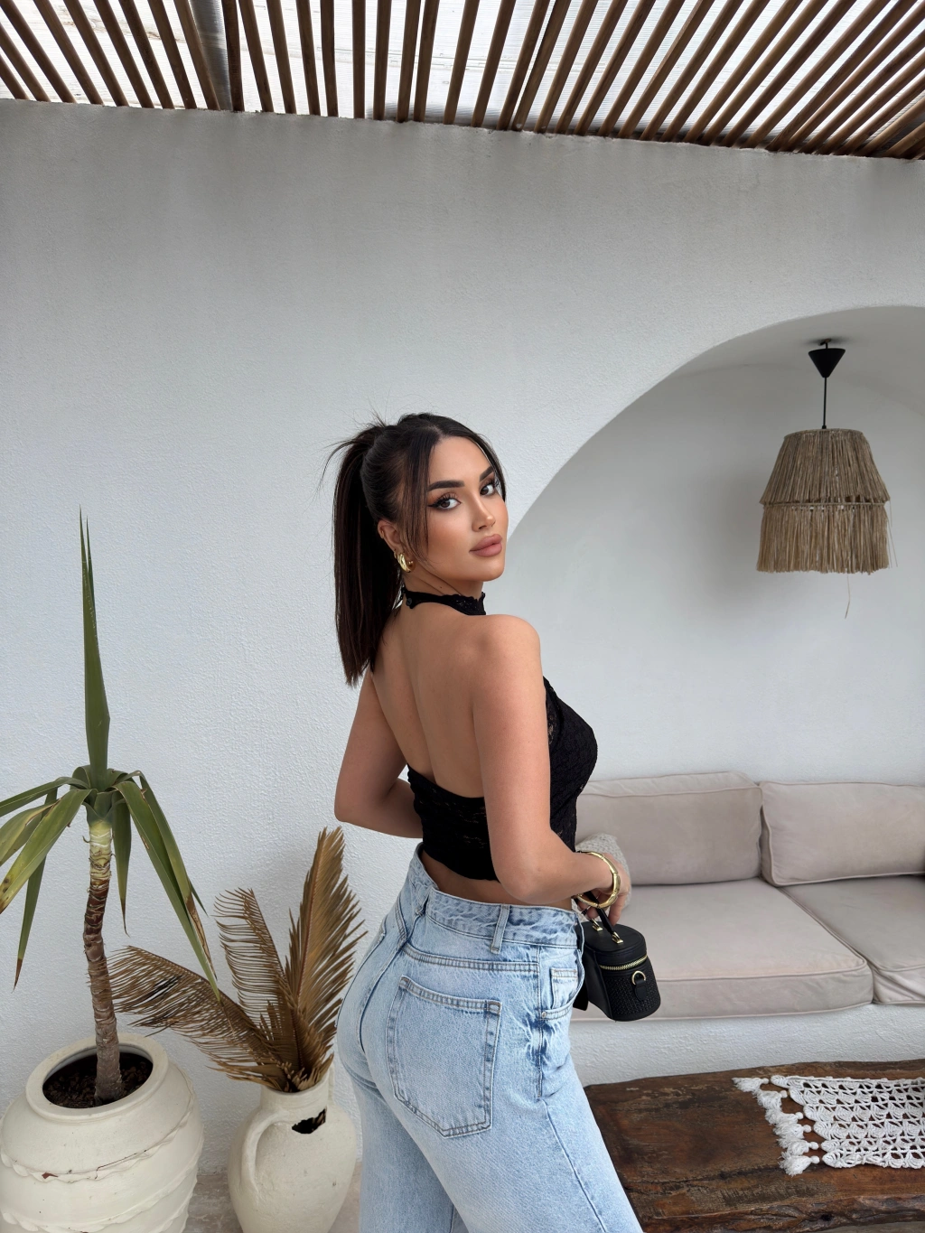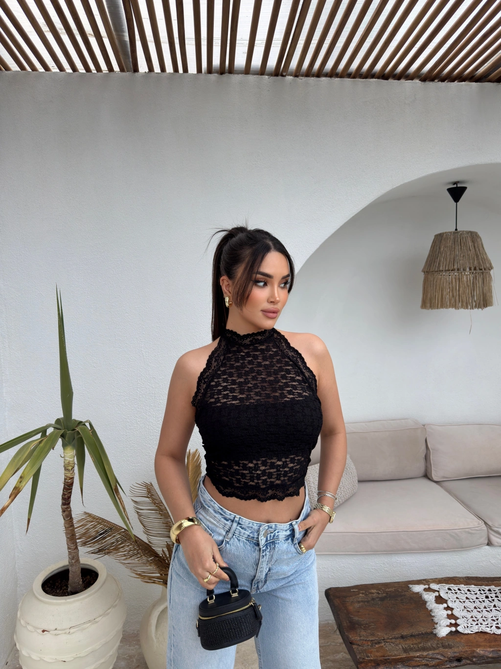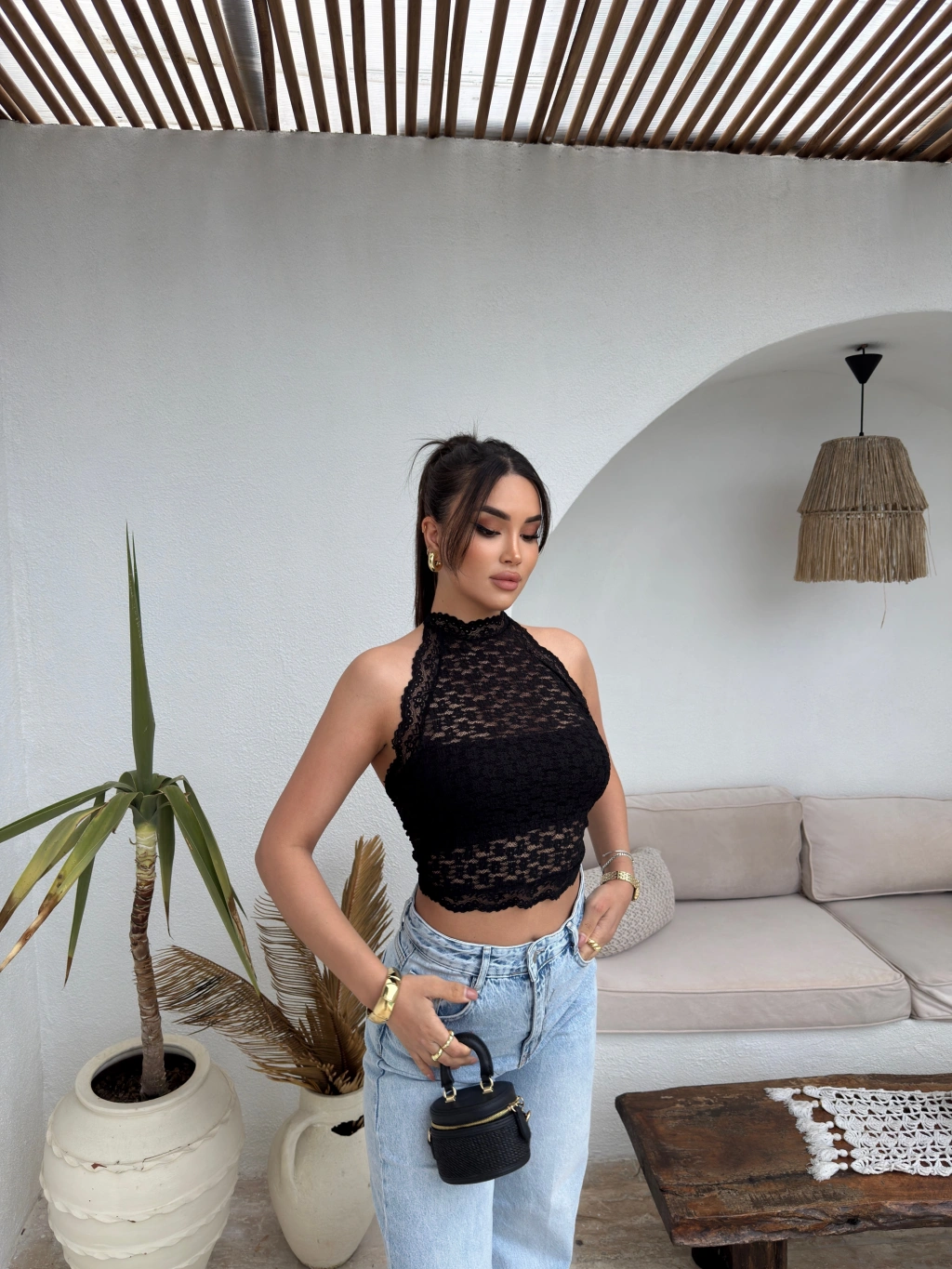 Siyah Boyundan Bağlamalı Astarlı Güpürlü Crop