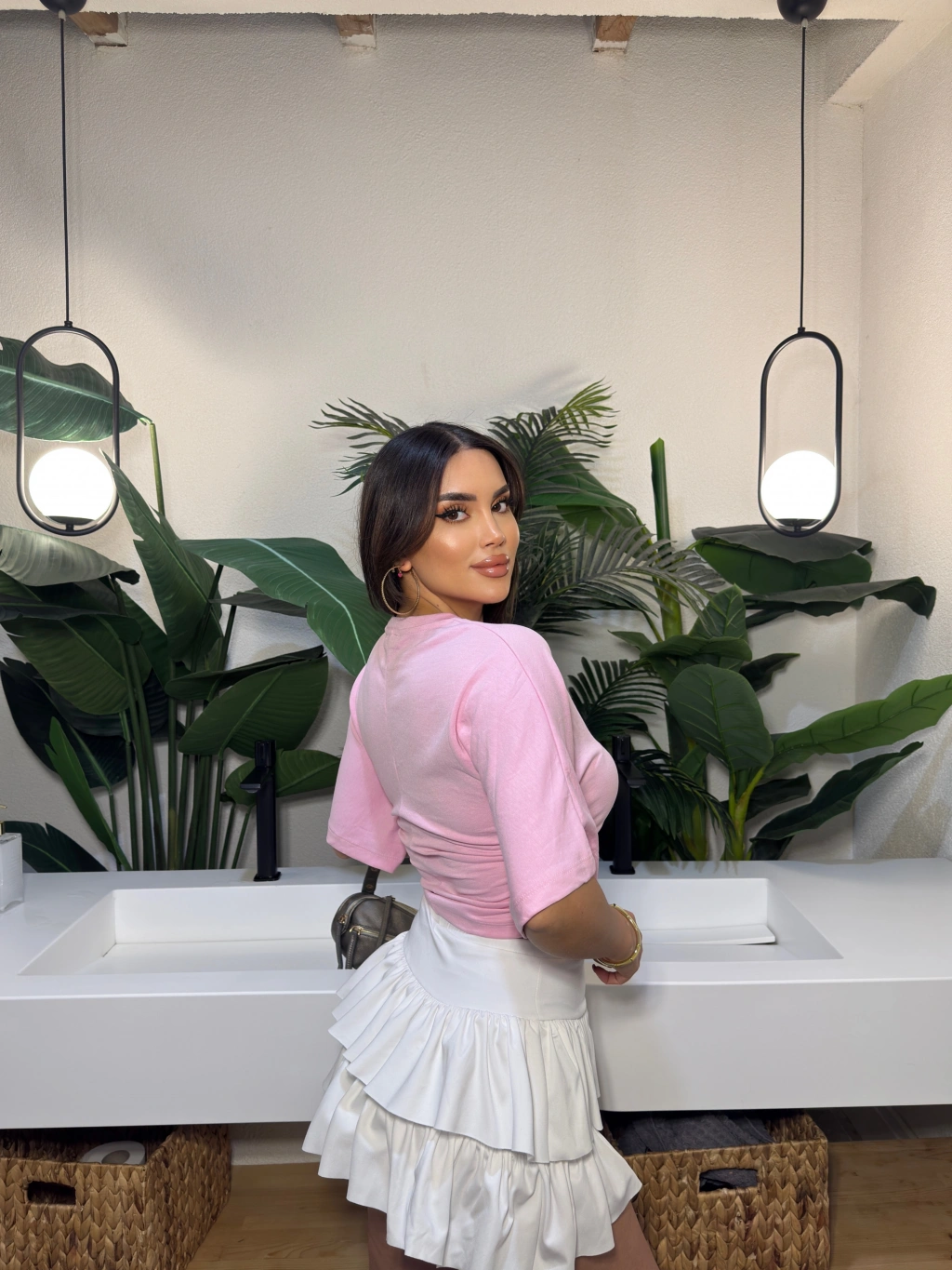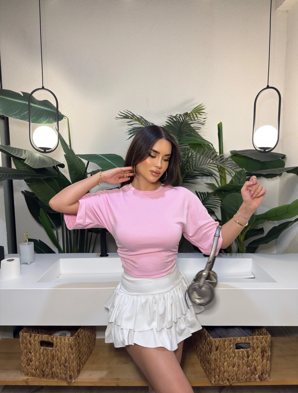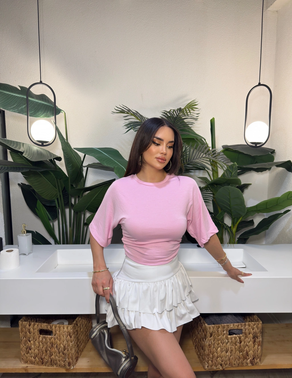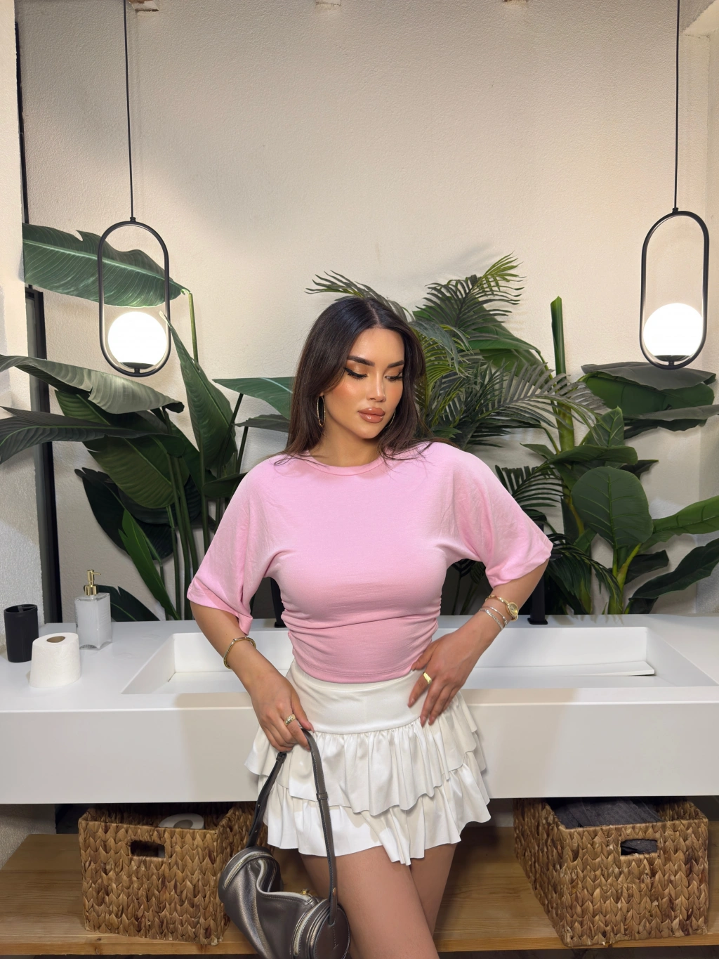 Pembe Kısa İspanyol Kol Basic Tshırt