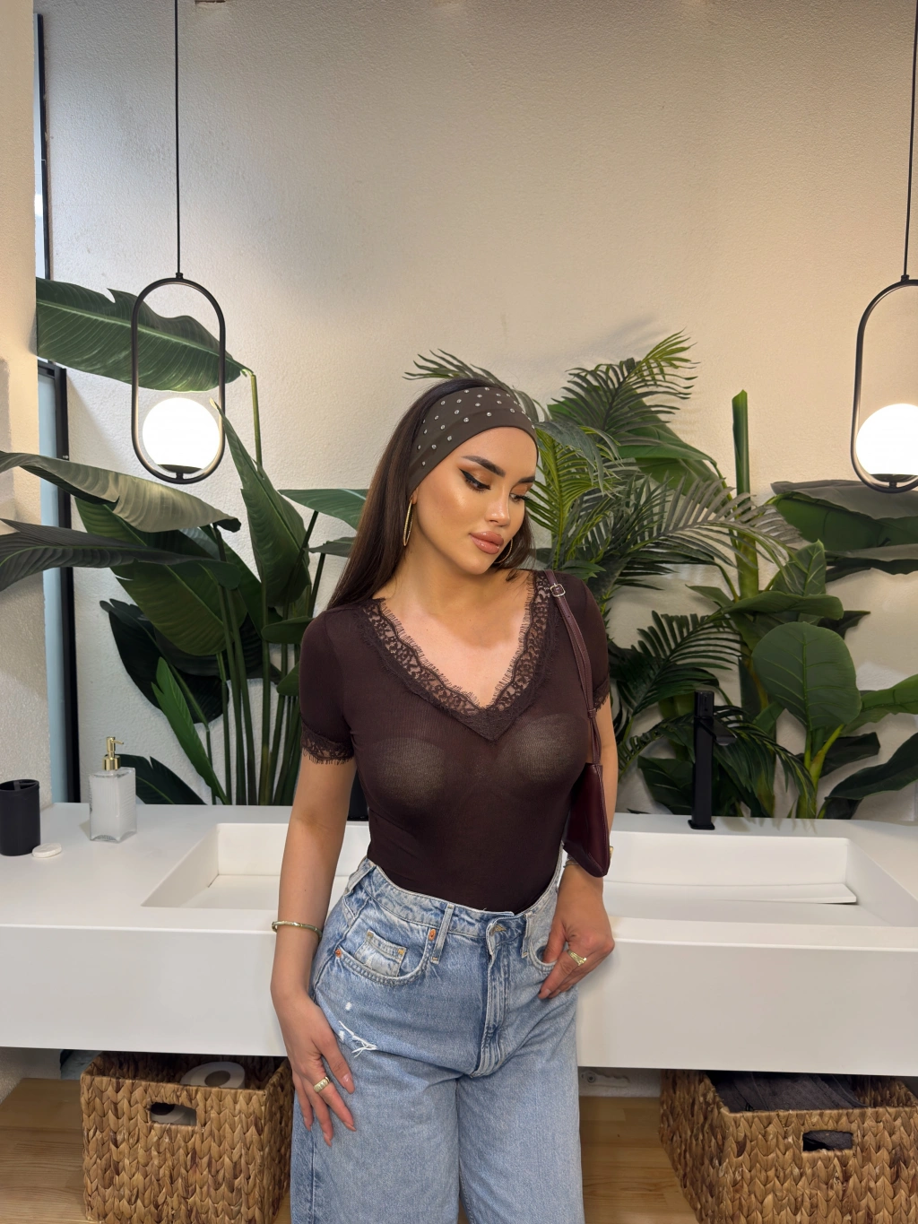 Kahverengi Transparan V Yaka Kısa Kol Dantel Bluz