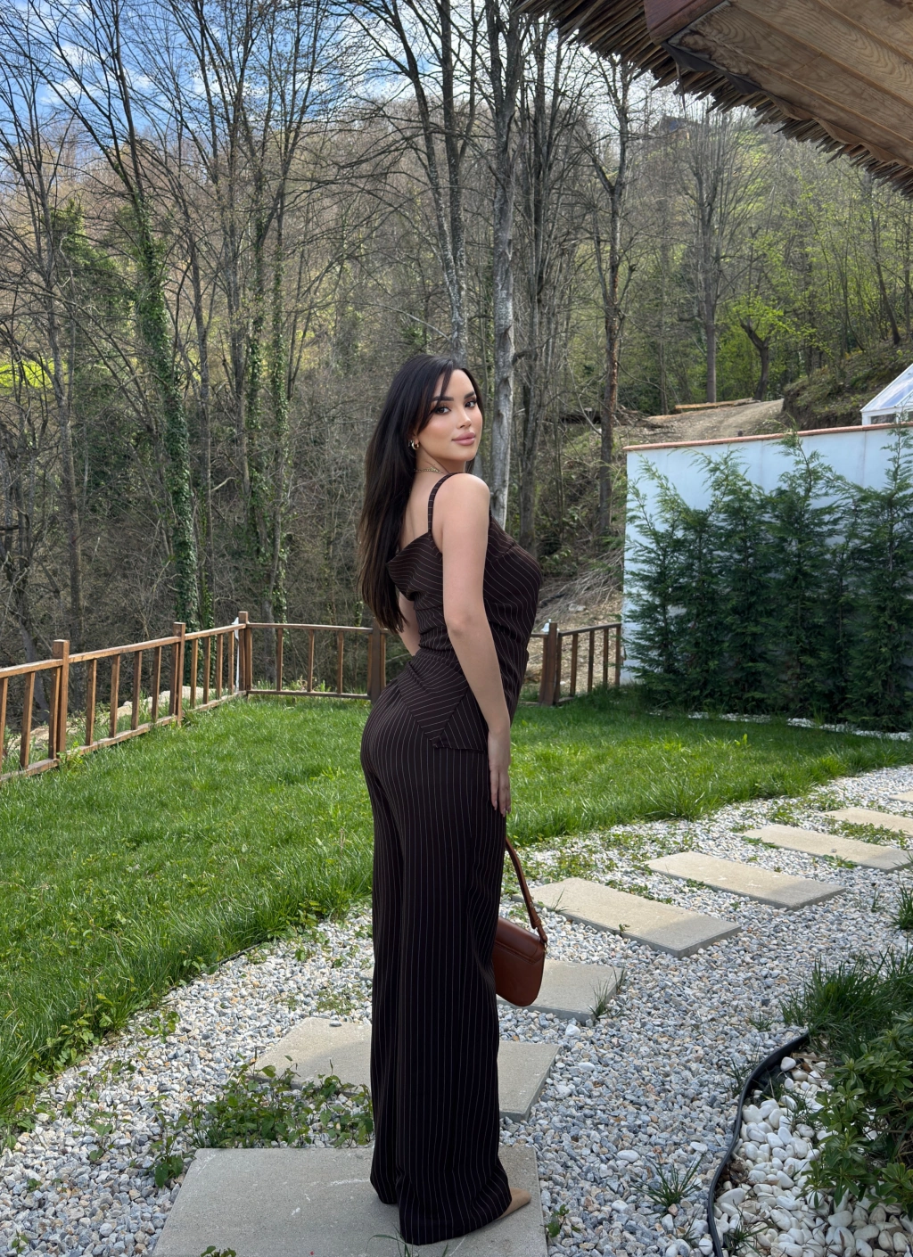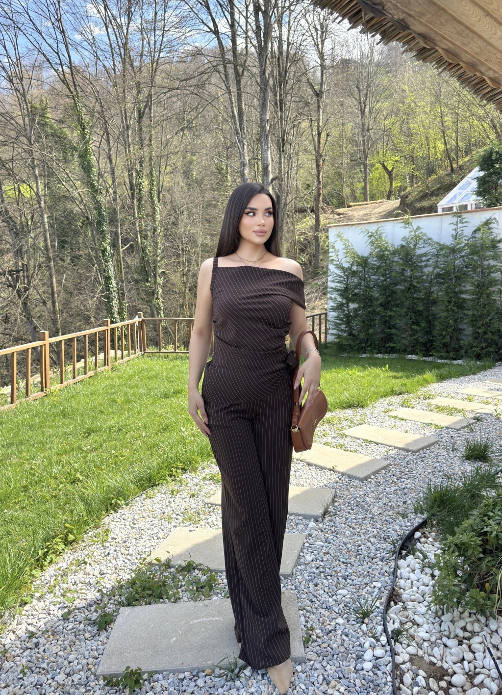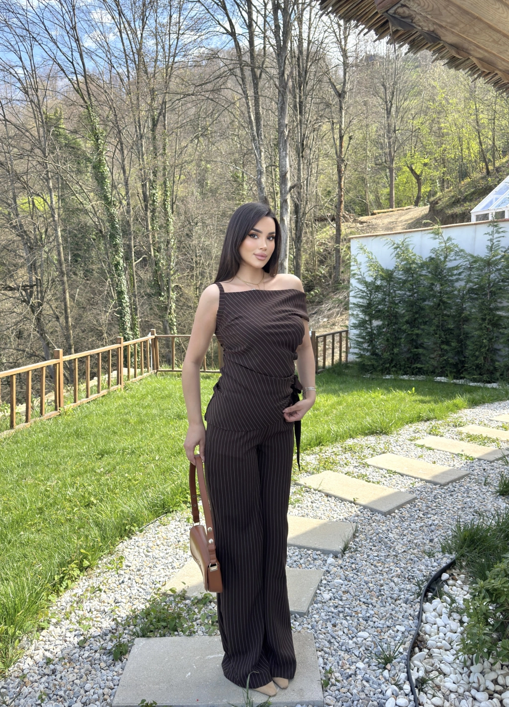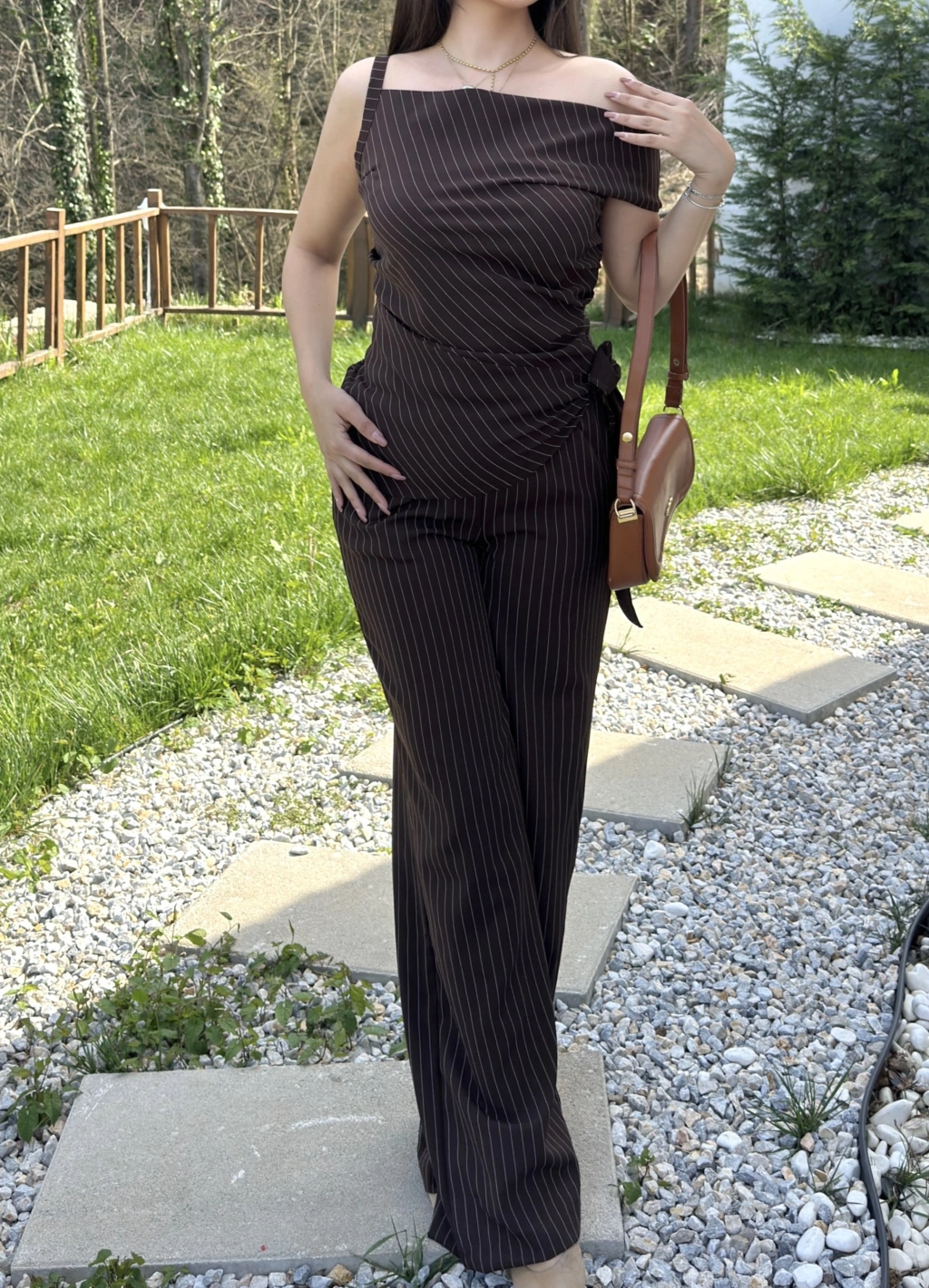 Kahverengi Çizgili Düşük Omuz Double Kumaş Takım