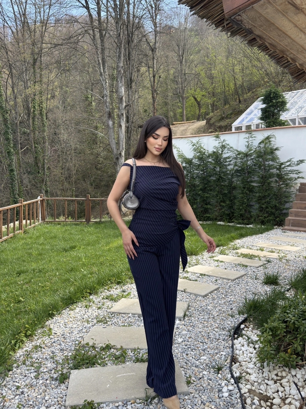 Lacivert Çizgili Düşük Omuz Double Kumaş Takım