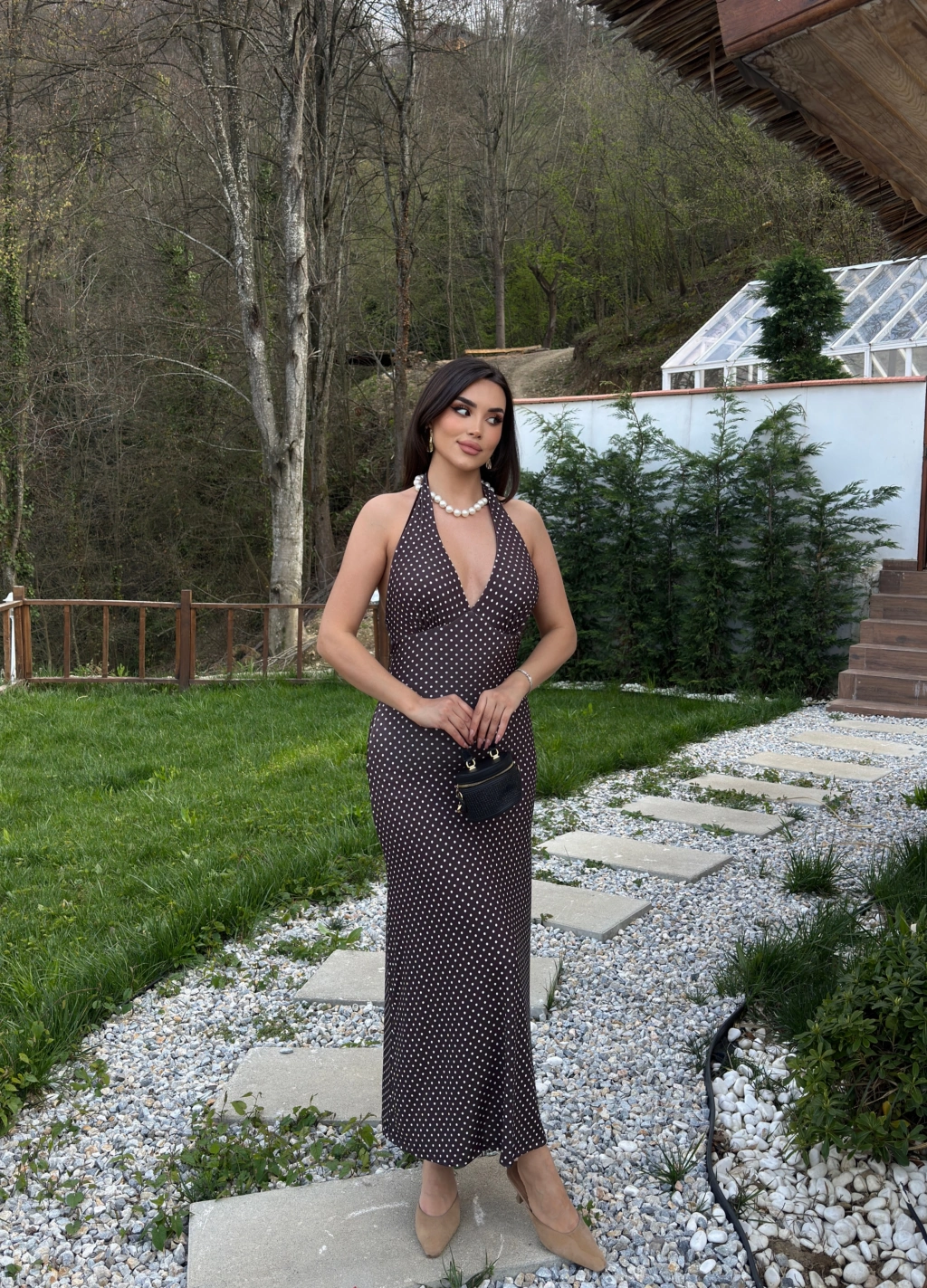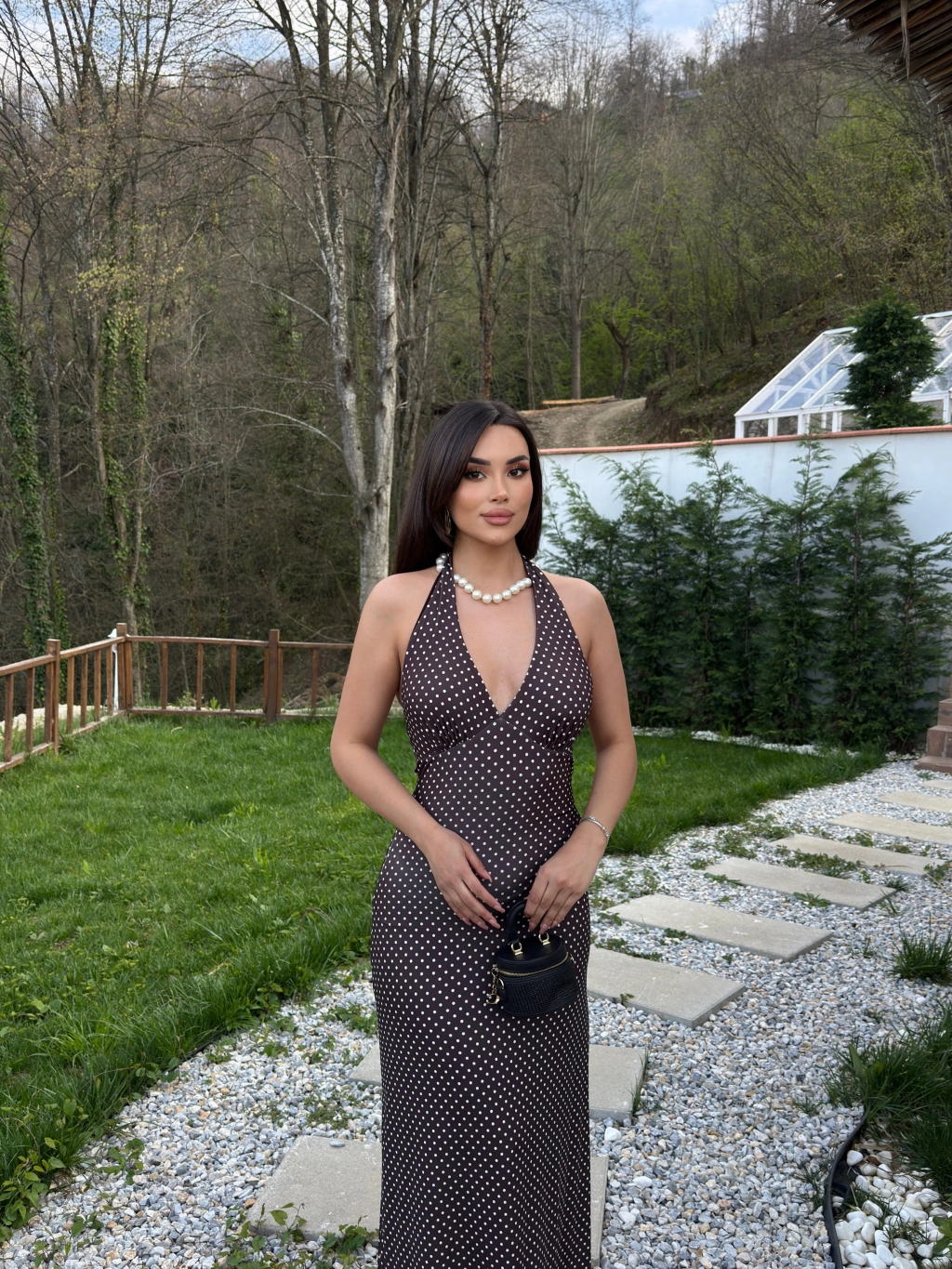 Kahverengi Boyundan Bağlamalı Puantiyeli Uzun Elbise