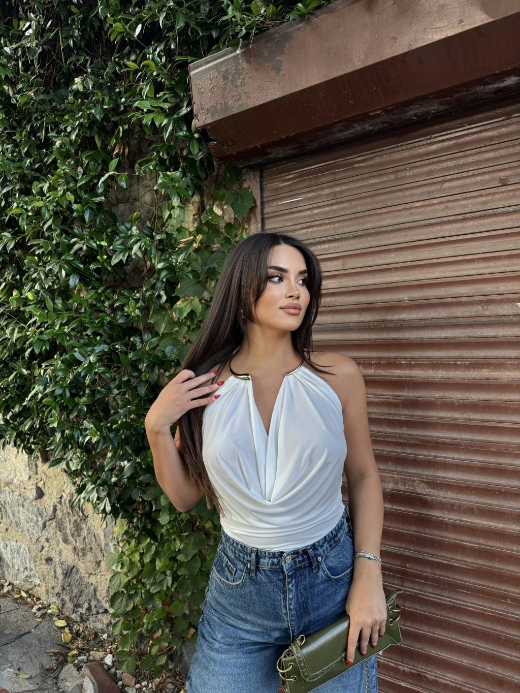 Beyaz Boyun Aksesuarlı Bodysuit