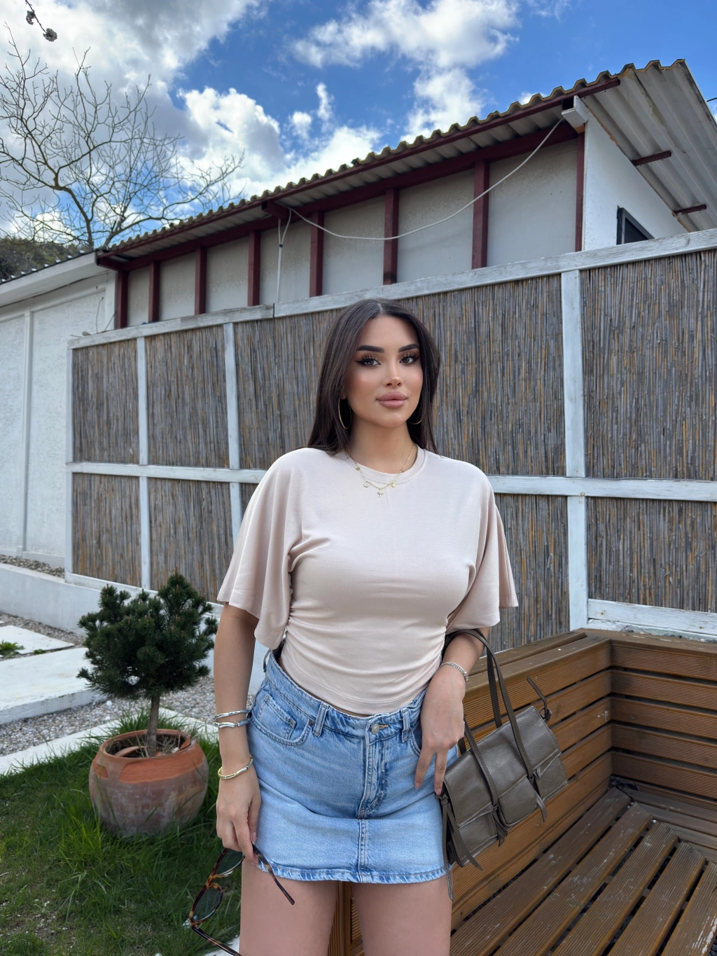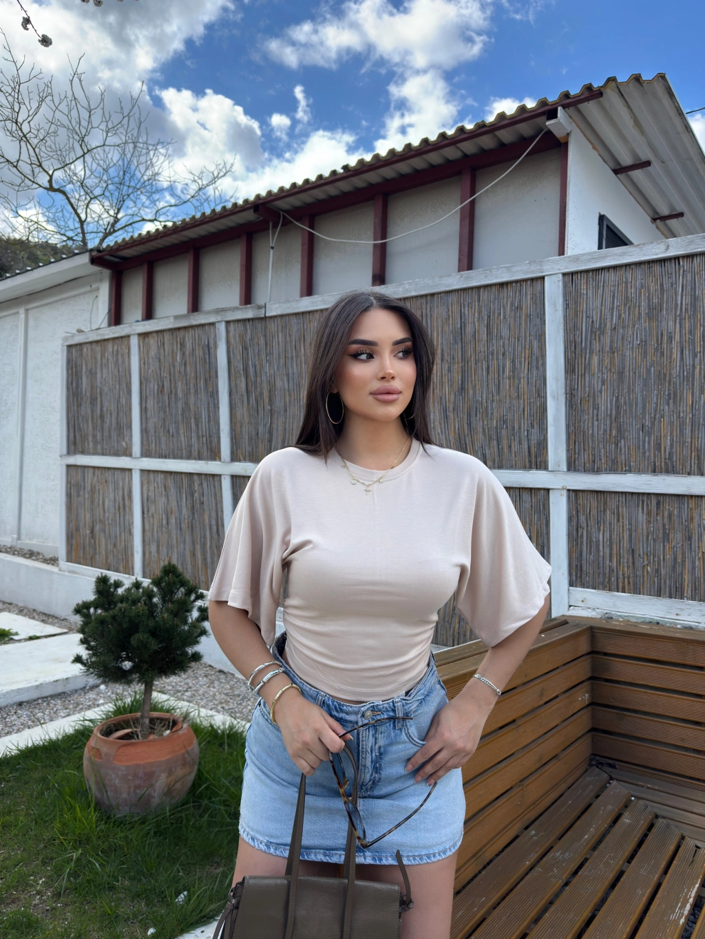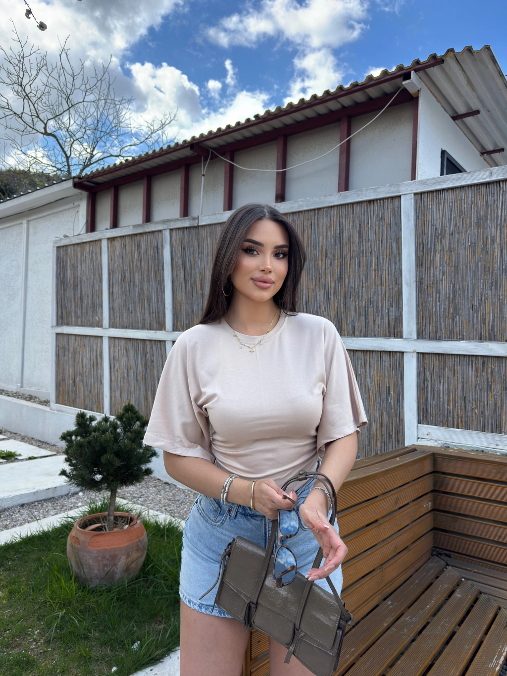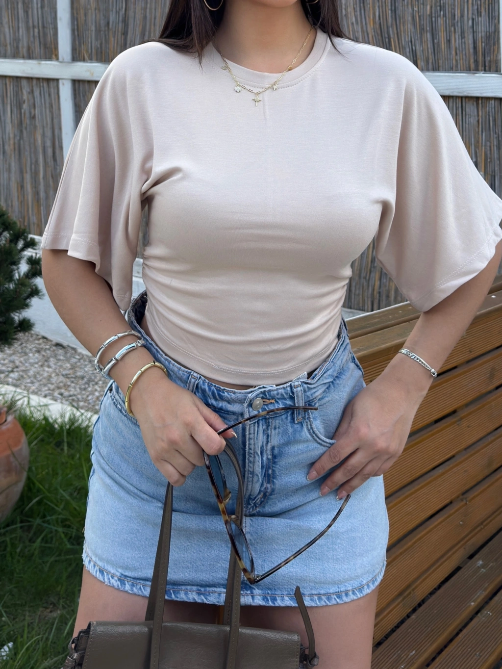 Bej Kısa İspanyol Kol Basic Tshırt