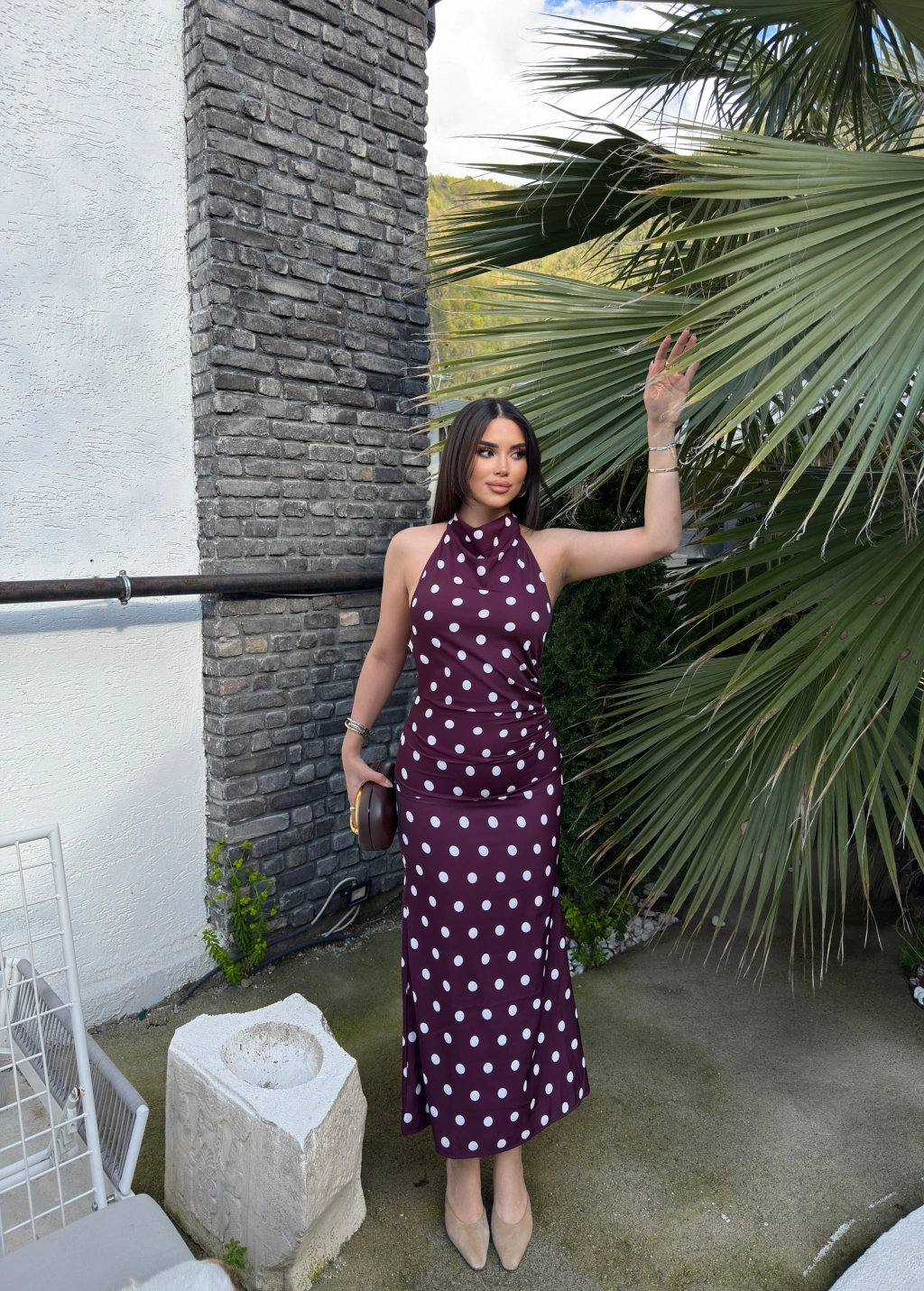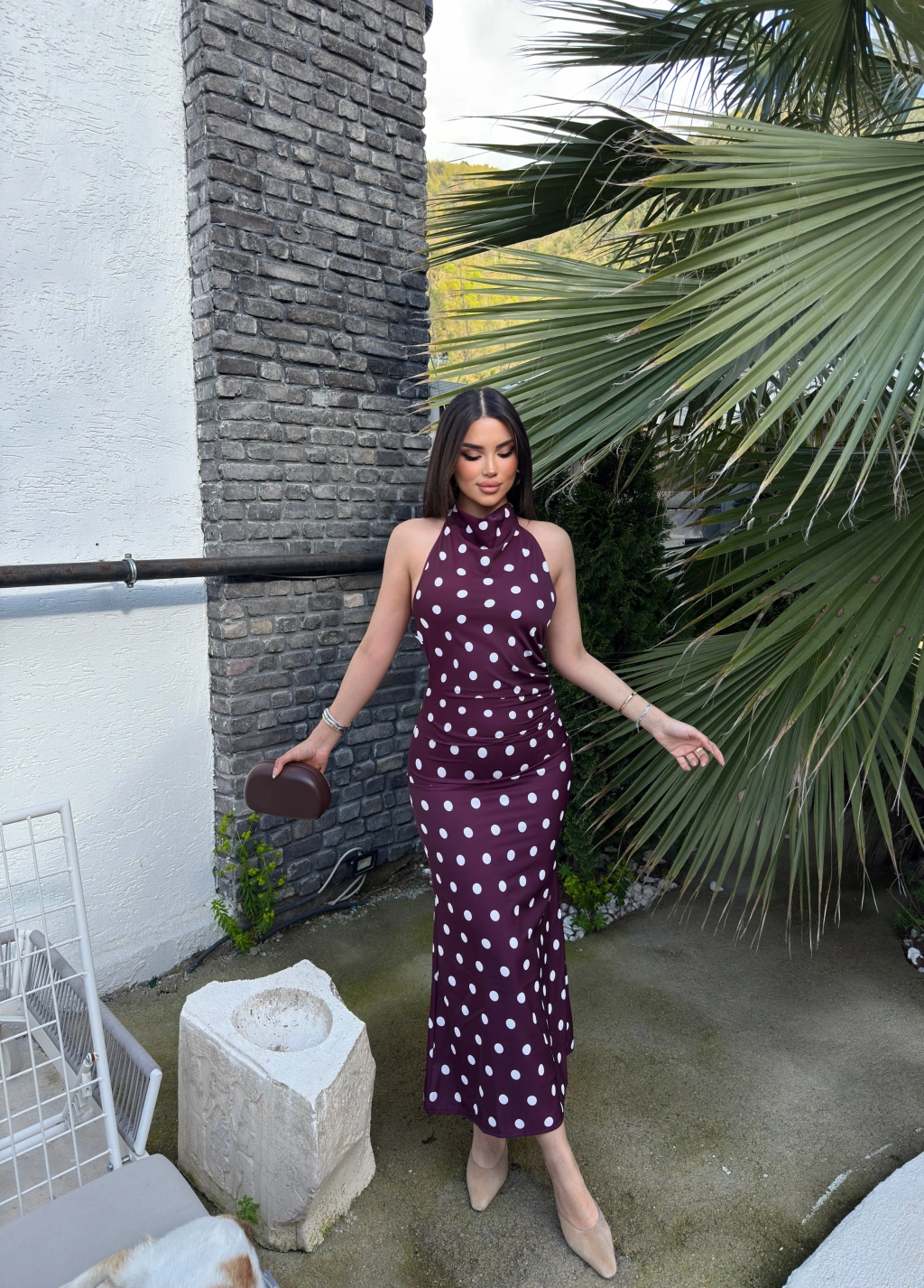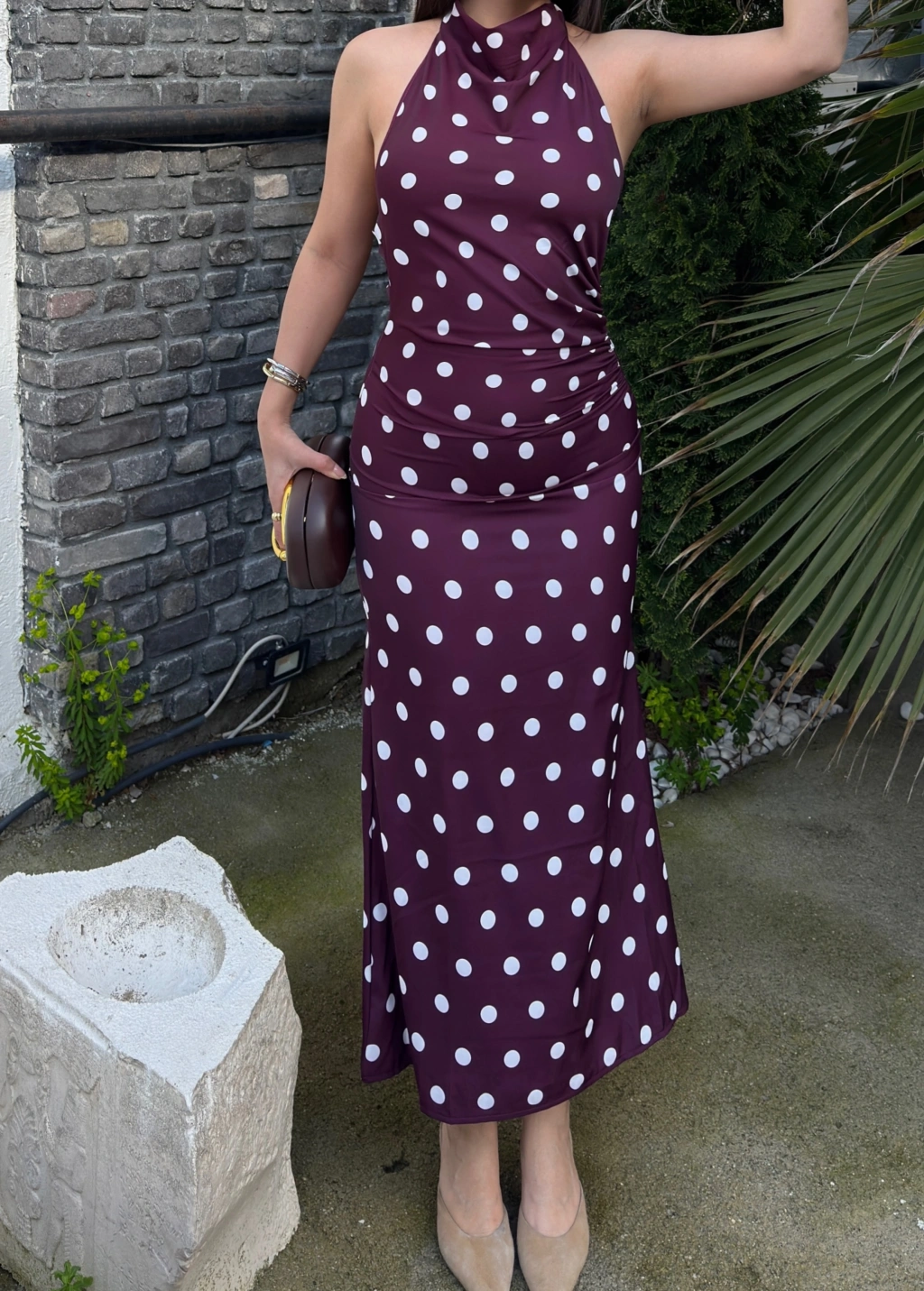 Bordo Puantiyeli Premium Uzun Elbise